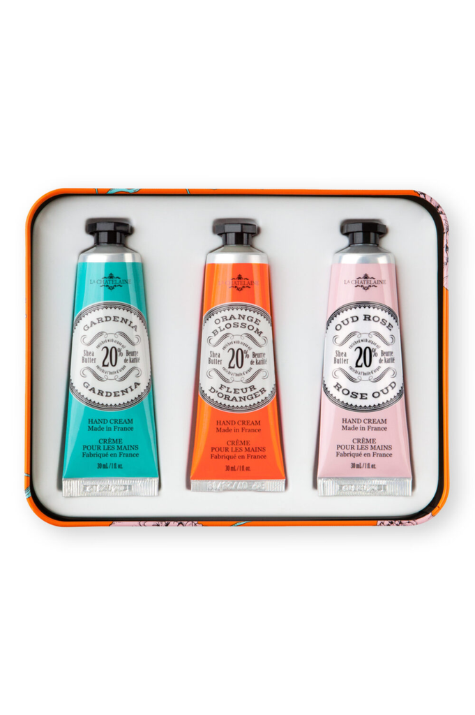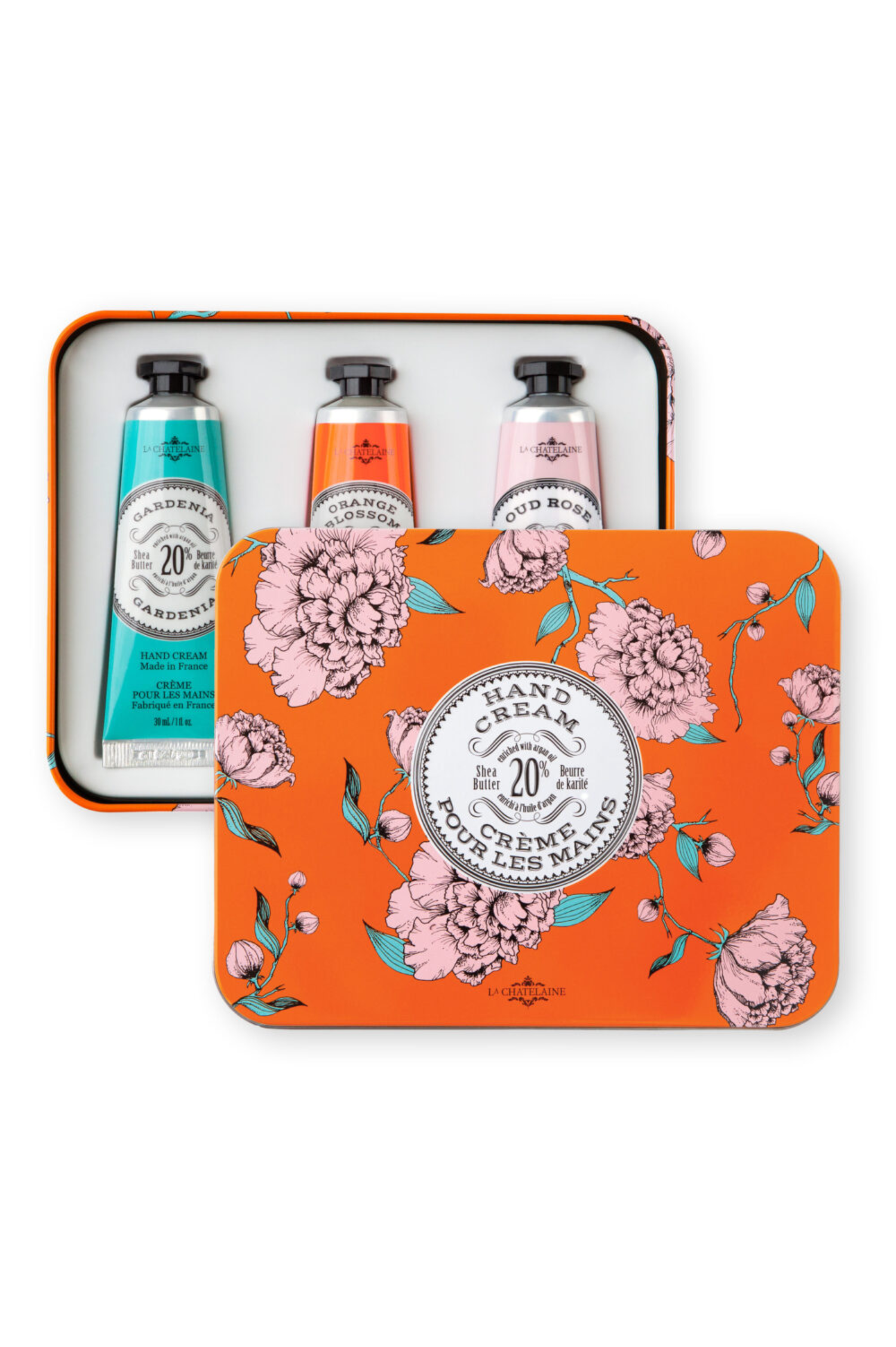 A trio of luxurious hand creams from the South of France, each blended with 20% organic shea butter, vitamin E, and argan oil to deeply moisturize, nourish and repair dry skin. These elegantly chic hand cream gift sets were created to pamper the most cherished people in your life. La Chatelaine’s meticulously designed embossed tins flaunt vibrant, flirtatious florals. The tins are so beautiful, they will be kept long after the hand creams have been enjoyed.