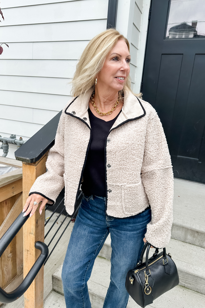 This reversible sherpa jacket is cozy on one side and sleek faux suede on the other. With fun details like black trim, raw edges, and cool seams, it’s perfect for layering. Snap it up or fold the collar down for a fresh look. Hip-length and boxy, it’s your go-to for weekend fun or everyday flair!