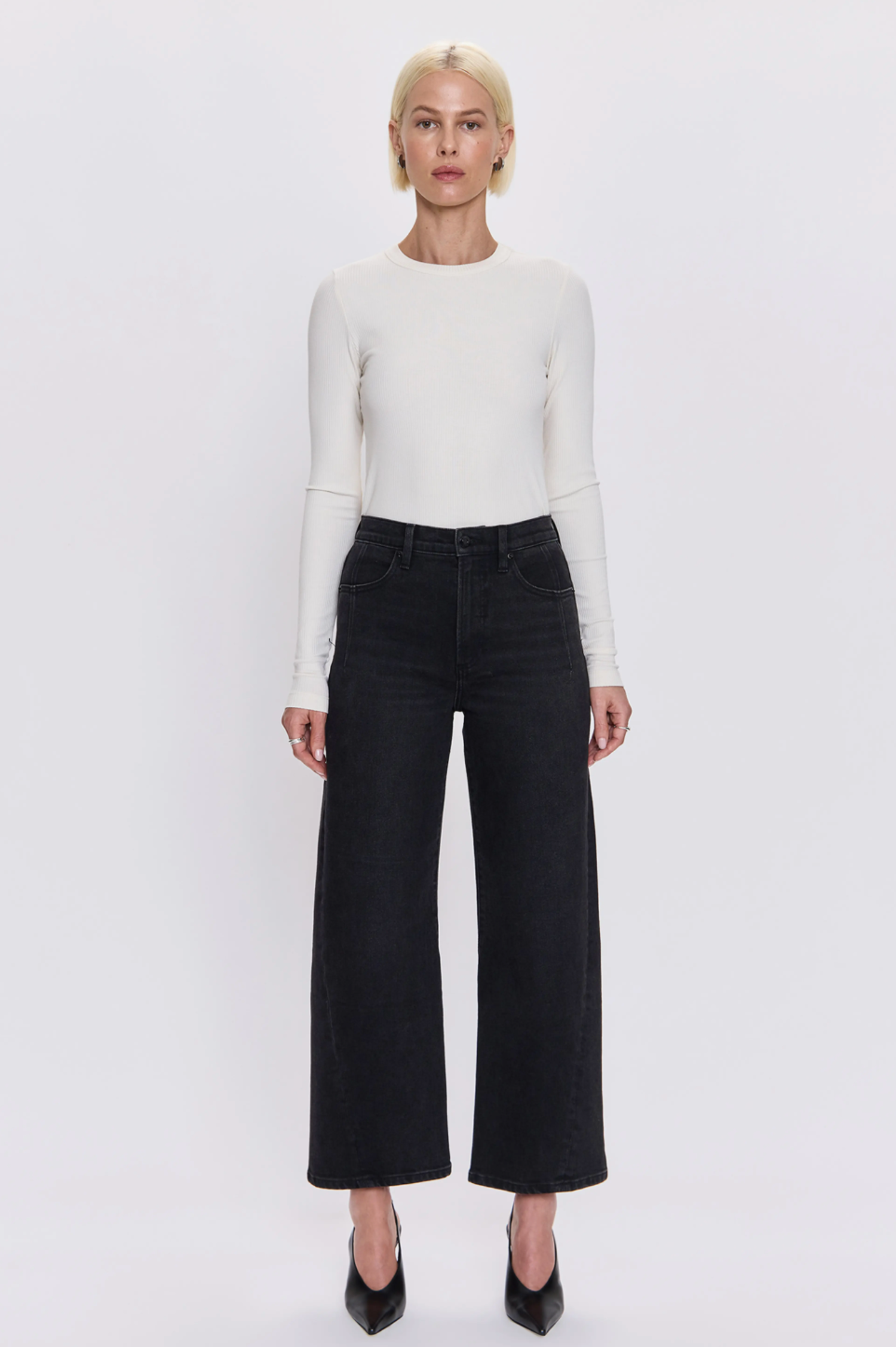 The new must-have jean with a twist. Kyra sits confidently at a high rise with our signature bowed leg silhouette and cropped 28" inseam. The subtle curve creates dimension while the wide ankle opening adds modern proportion with a new wide angle for the season. Fashion detail seaming, including a twisted seam that moves forward and yoke seams in the back, brings modern denim classic sophistication. Crafted from our signature comfort stretch denim in Soho, a medium vintage wash with subtle fading that feels both contemporary and timeless.