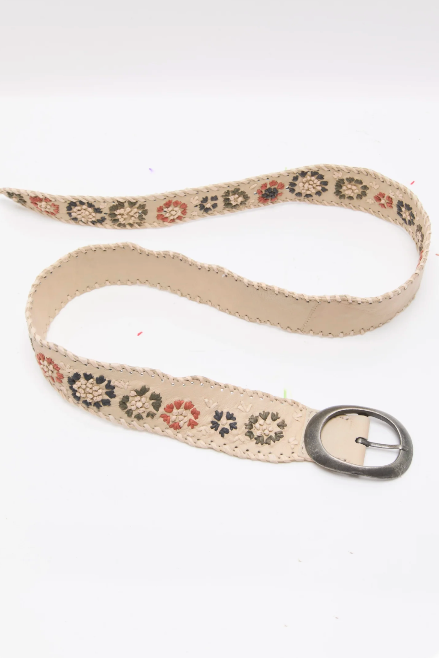 This leather belt, adorned with woven raffia trim and florals, adds a playful finishing touch to any 'fit.