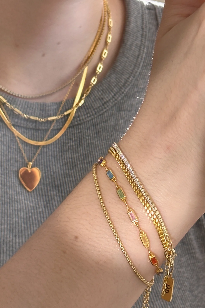 Vintage-inspired rainbow baguette chain bracelet.