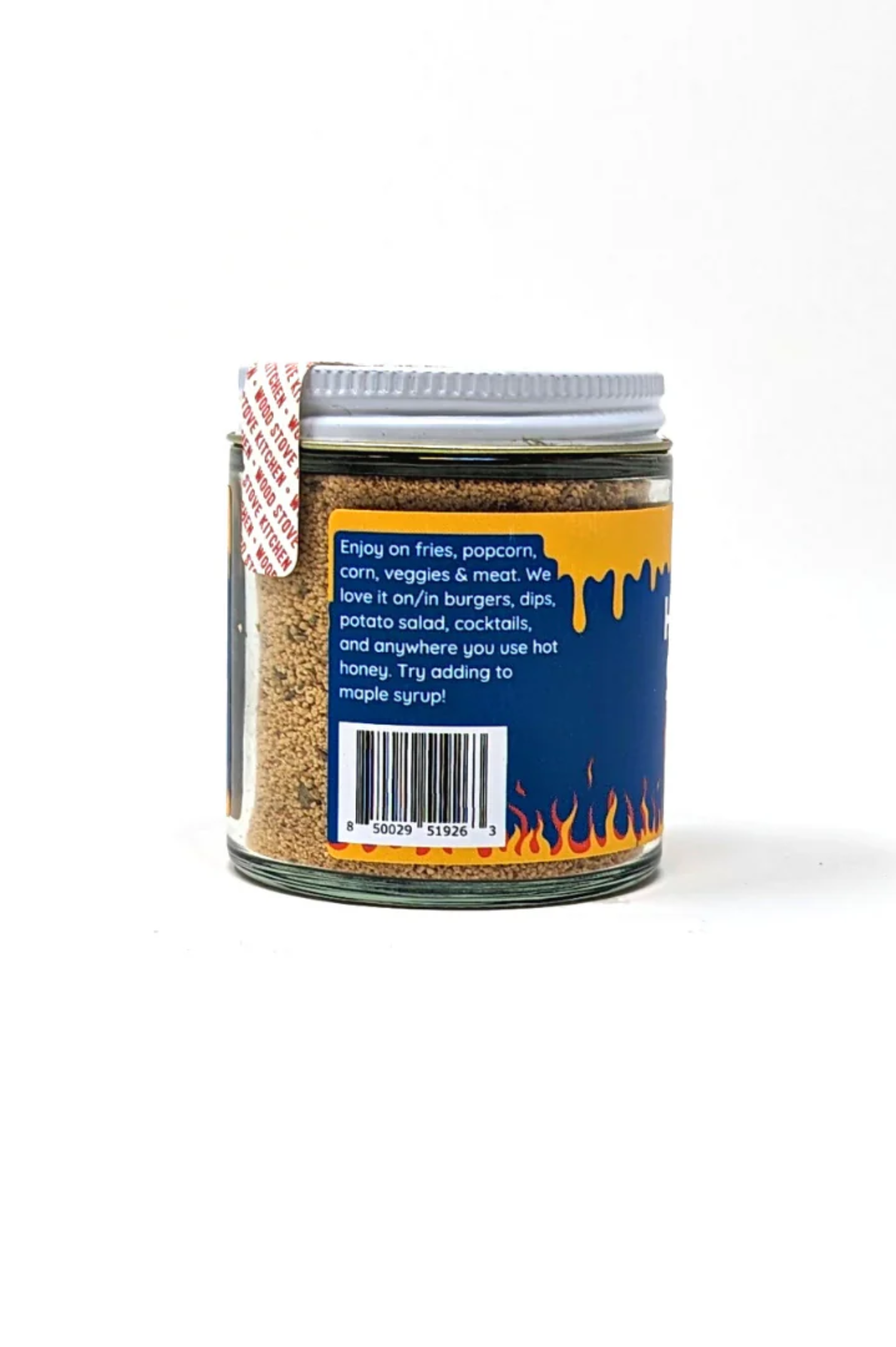 Our Hot Honey Sprinkles (Chipotle & Honey Spice Blend) are delicious. The dried, granulated honey is spiced up by chipotle pepper. It is warm with a bit of heat. We love it on chicken, pork, fish, veggies, popcorn, chips, fries, salads, marinades, dips, and more. It even makes a great addition to a rimming salt for margaritas.