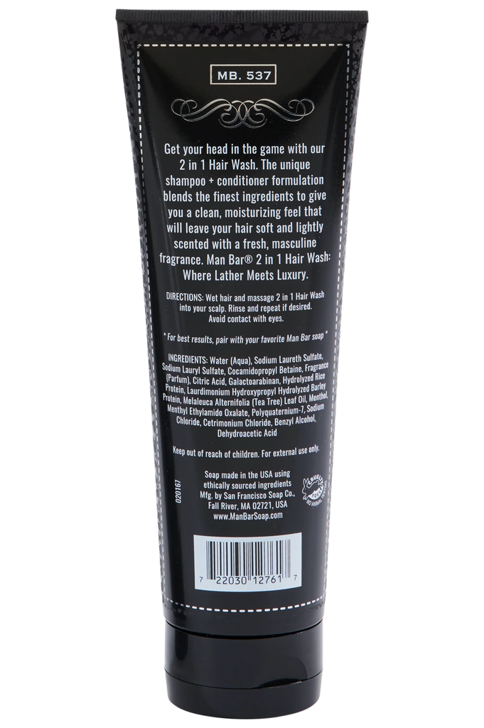 Get your head in the game with our 2-in-1 Hair Wash. The unique shampoo + conditioner formulation blends the finest ingredients to give you a clean, moisturizing feel that will leave your hair soft and lightly scented with a fresh, masculine fragrance. Man Bar 2-in-1 Hair Wash – Where Lather Meets Luxury.