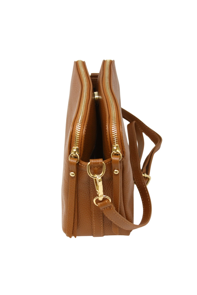 This elegant crossbody purse features genuine Italian leather and a slim profile that balances style with practicality. It includes three main compartments—two secured with full-length metal zippers and a central section with a magnetic snap closure. The long, adjustable strap allows for versatile wear as a shoulder bag or cross-body, providing convenience and comfort for everyday use.
