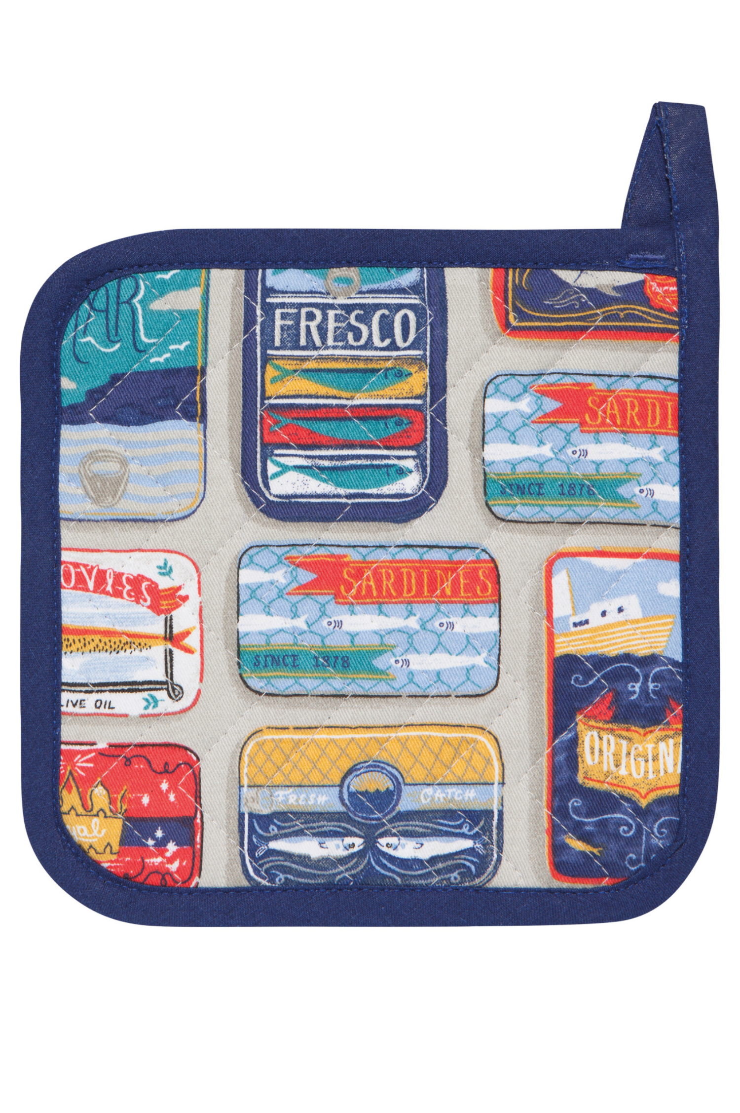 Cross oceans and time with this seafarer-inspired Del Mar Chef potholder. It offers major heat protection while lifting and moving items from your stove or oven. Made from 100% cotton with polyester fill, it measures 8 by 8-inches square. Packed with color and charm, this design from the Del Mar collection tells a tinned fish tale of the seas.