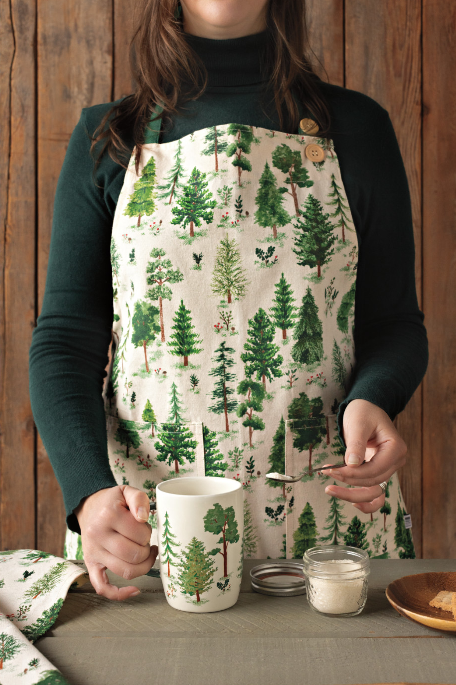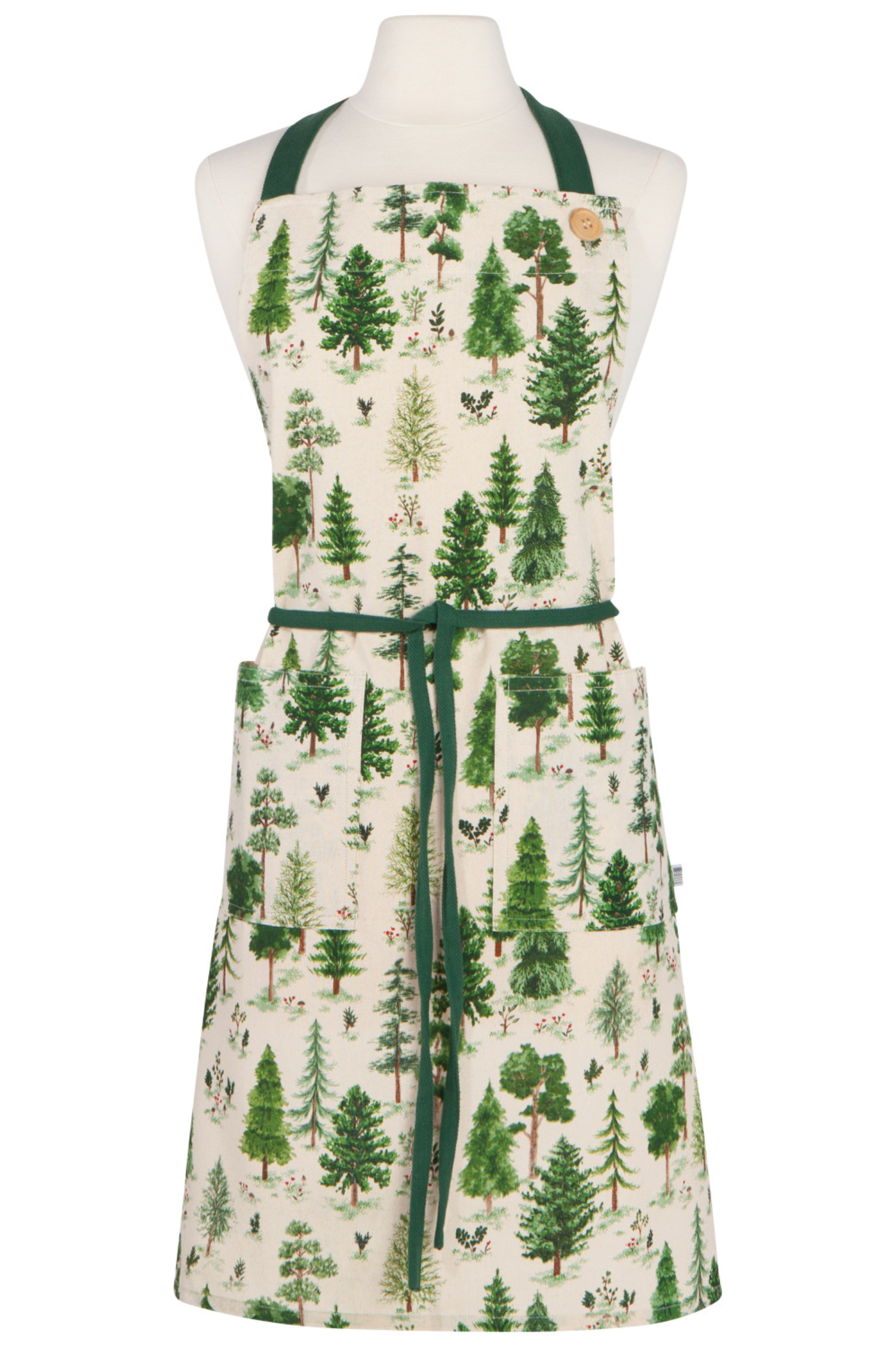 This Woodland soft cotton apron is paired with extra long waist ties and a wooden button closure for function and charm.