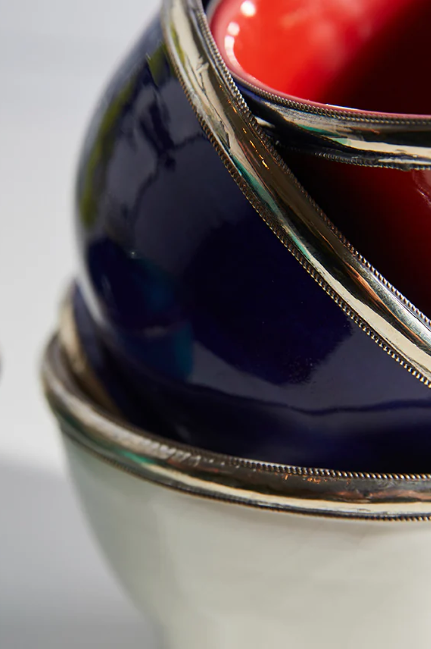A stunning marriage of traditional Moroccan artistry and elegant design, these handcrafted serving bowls will be a centerpiece of your dining experience. The vibrant glazes combined with the delicate Berber silver trim boast a distinctive design that will add an artistic flair to any table setting. Ideal for serving soups, salads, and side dishes, these bowls make a thoughtful housewarming gift or the perfect touch to your next dinner party.