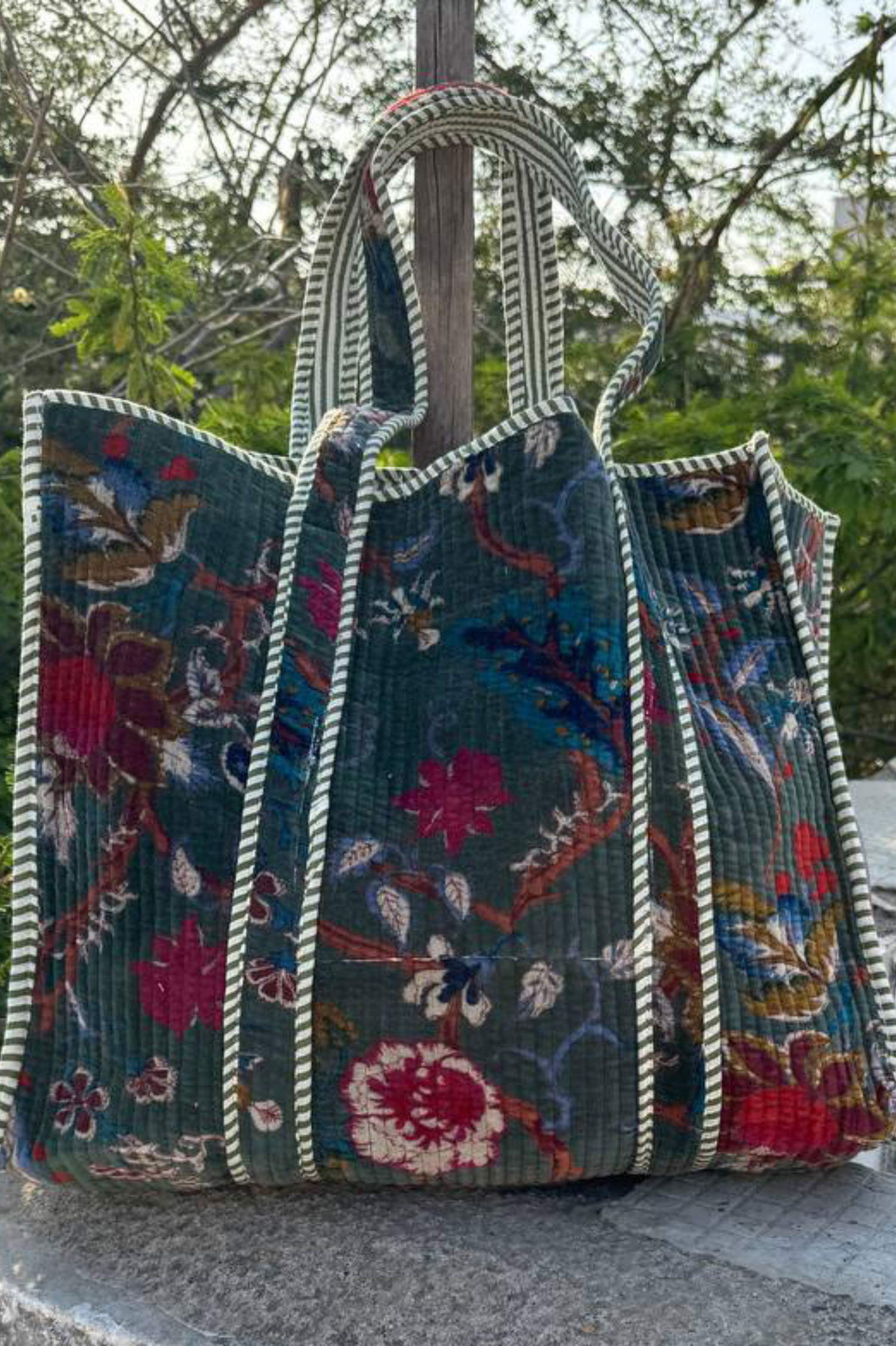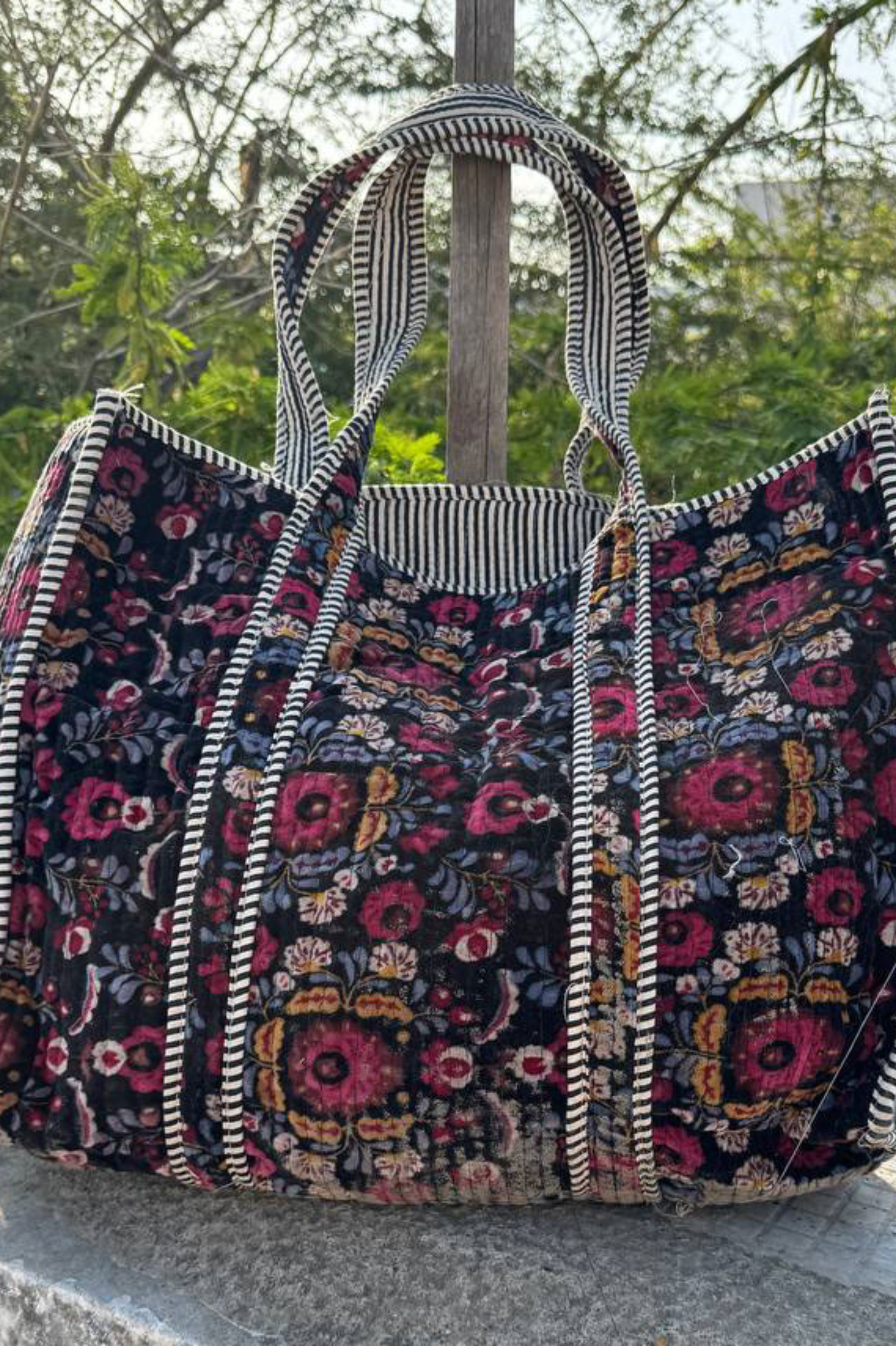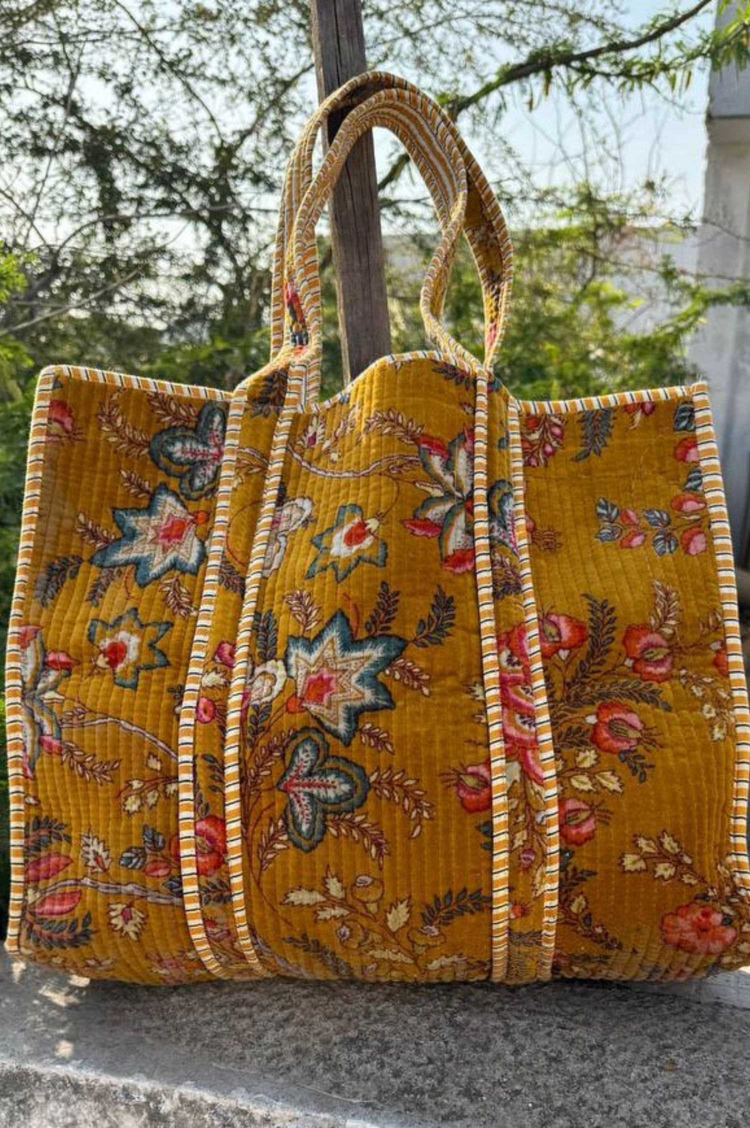 Handcrafted by Indian artisans, this block print velvet tote features authentic screen-printed designs on premium fabric. Versatile and durable, it works perfectly for shopping, travel, or everyday errands. The vibrant patterns and rich textures add elegant style to any look.