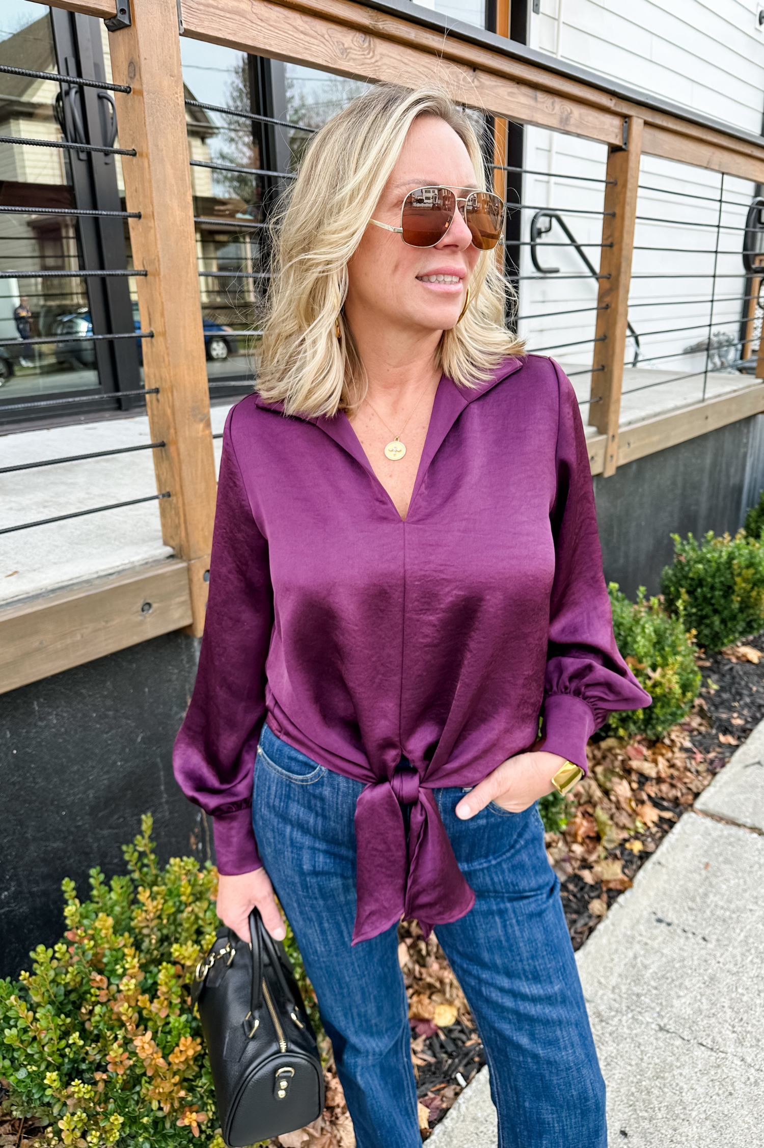 This satin top features long sleeves with gathered, buttoned cuffs for a softly voluminous look. The open neckline and pointed collar add a touch of sophistication, while the tie-front detail creates a flattering, feminine finish.