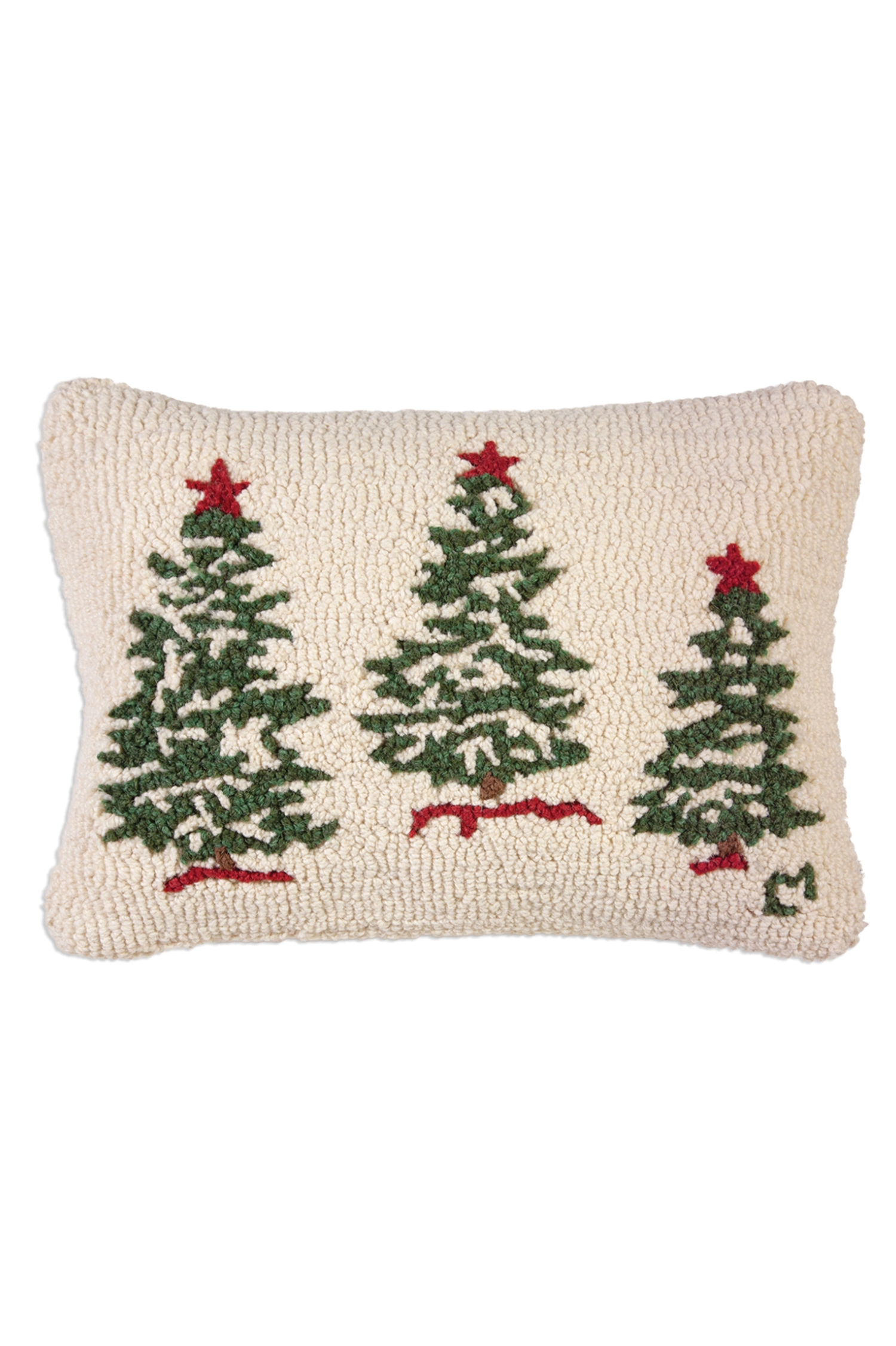 Three winter trees in the wild are topped with a festive red star celebrating the Christmas holiday. Christmas colors of red, green, and white are the perfect finishing touch for your holiday décor. Designed in Vermont by Laura Megroz. Our Trees On White - 14" x 20" wool pillow has been hand-hooked with exceptional care by skilled craftsmen. The result is a premium decorative pillow that adds a charming touch of handcrafted excellence to any bed, sofa, or rocking chair.
