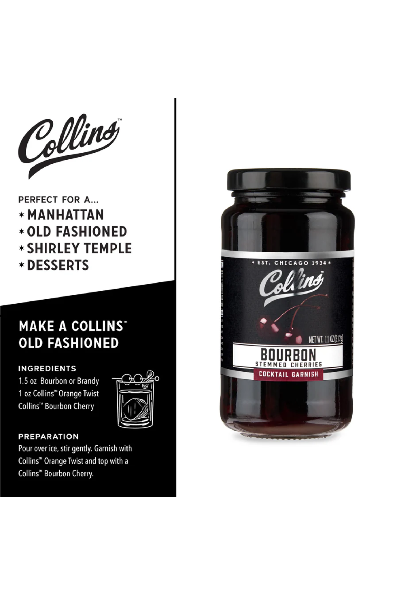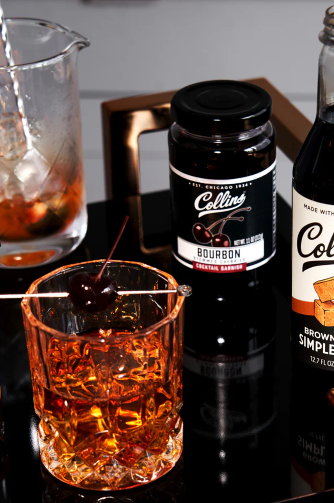 Collins Bourbon Cherries celebrate the iconic pairing of dark cherries and real whiskey.  Made with award-winning Heritage Distilling BSB (Brown Sugar Bourbon), these go above and beyond the usual bourbon cherry with an extra hit of cinnamon and spice. Perfect for Manhattans or an Old Fashioned, Collins Bourbon Cherries boasts a richer, more complex depth of flavor that stands up to strong cocktails better than the usual maraschino.