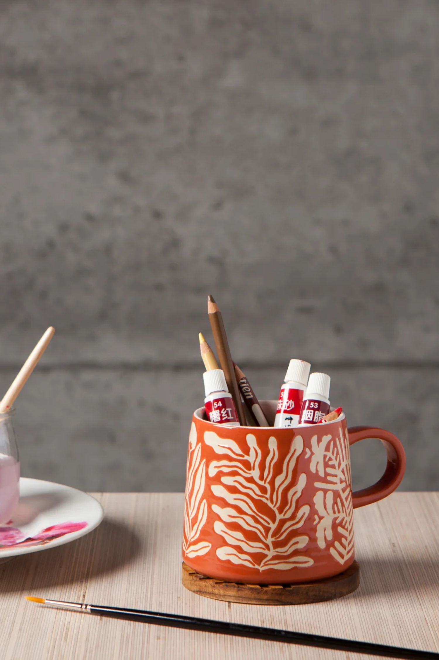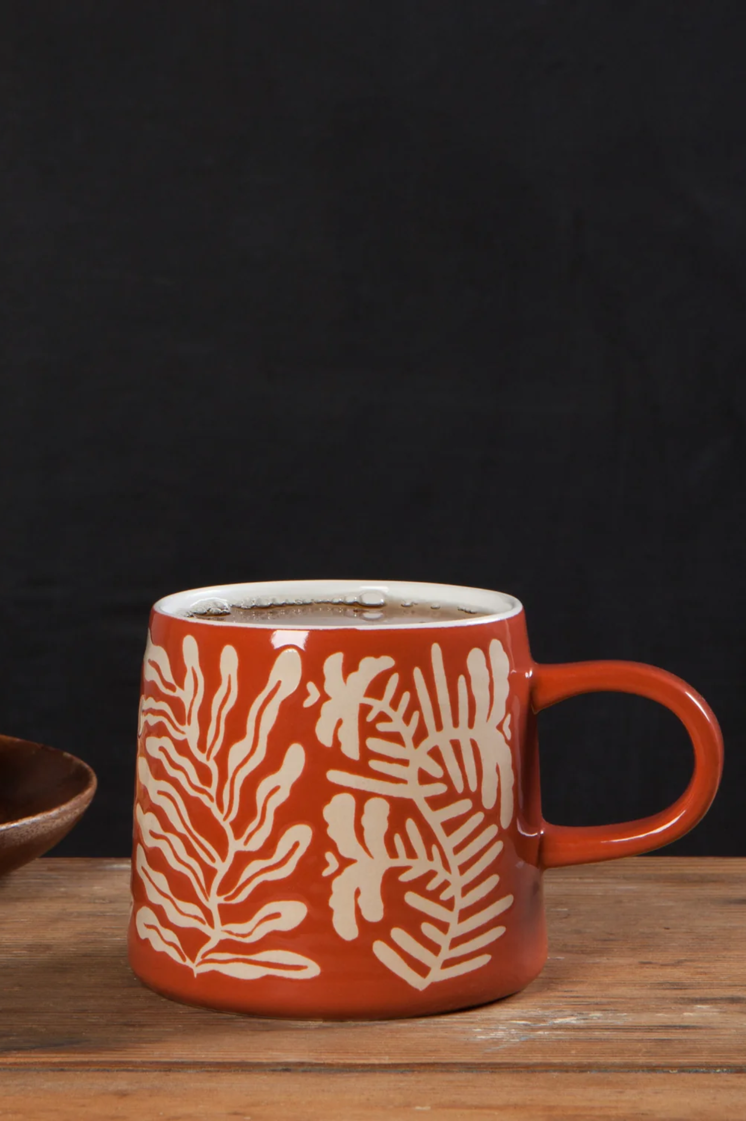 Infuse tableware with botanical beauty by adding this Entwine Imprint Mug by Danica Studio. Enchanting elements of leaf, bloom and vine and a rich rust and soft blue color scheme give this stoneware mug rustic radiance. Crafted with a special wax-resist technique, Imprint mugs feature distinct patterns on every piece. Textured designs and rich glazing enhance their tactile appeal, making every sip a sensory experience.