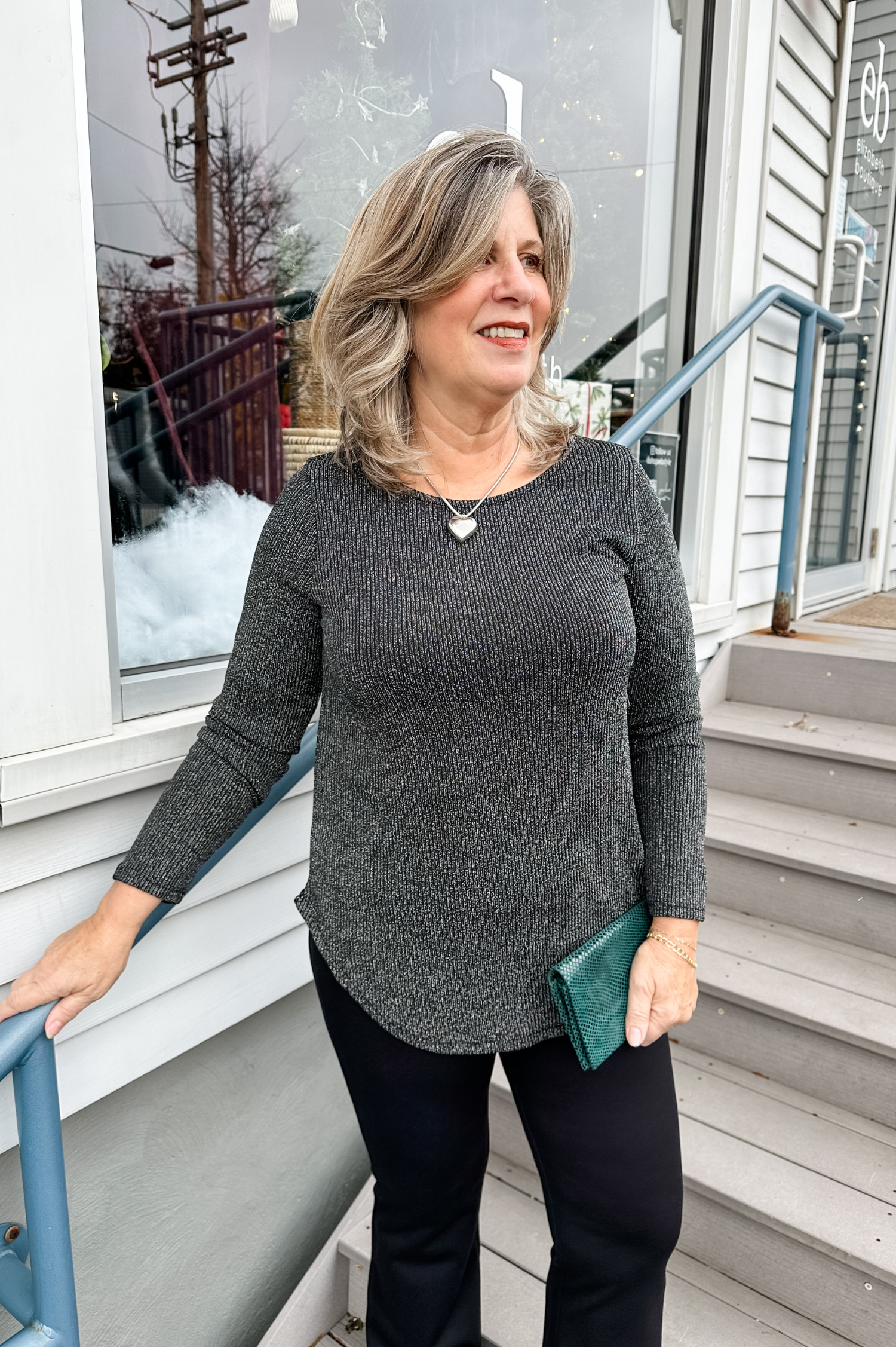 Add a touch of shine to your everyday look with this long sleeve top, crafted from a metallic stripe knit. Featuring a flattering scoop neckline and a curved shirttail hem, it blends comfort with statement style. Designed as an easy pull-on style, it’s perfect for effortless day-to-night dressing.