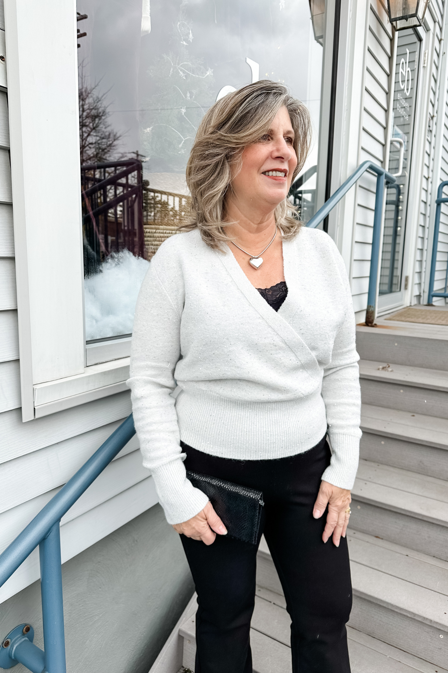 Elevate your knitwear with this effortlessly chic wrap-style sweater. Designed with a crossed V-neckline and slightly dropped shoulders, it creates a flattering silhouette that feels both modern and timeless. The subtle sequin detailing woven into the fabric adds a touch of shimmer, making it perfect for day-to-night wear. Finished with long sleeves and a wide ribbed band at the waist, this pull-on style offers a comfortable yet polished fit.
