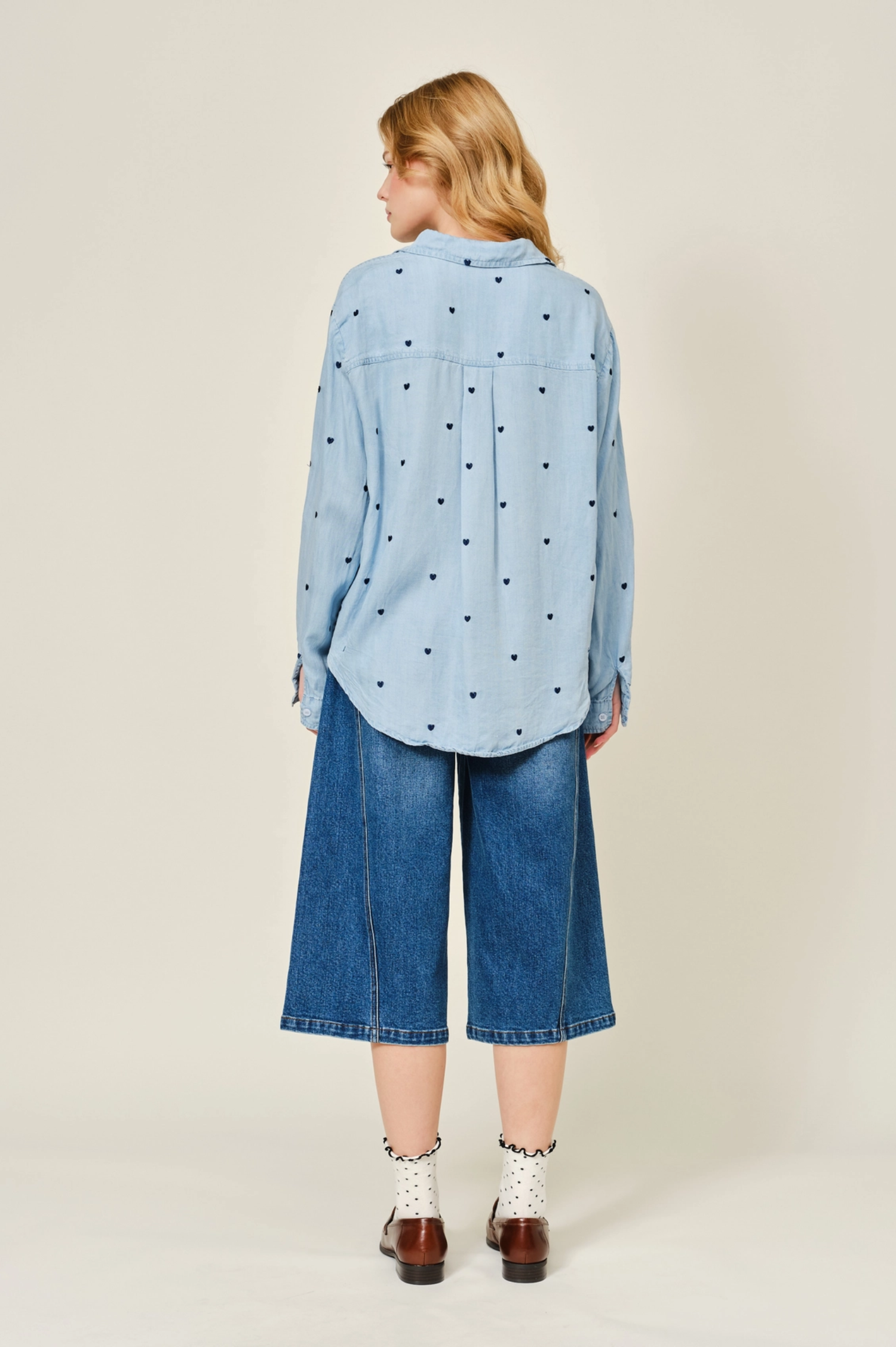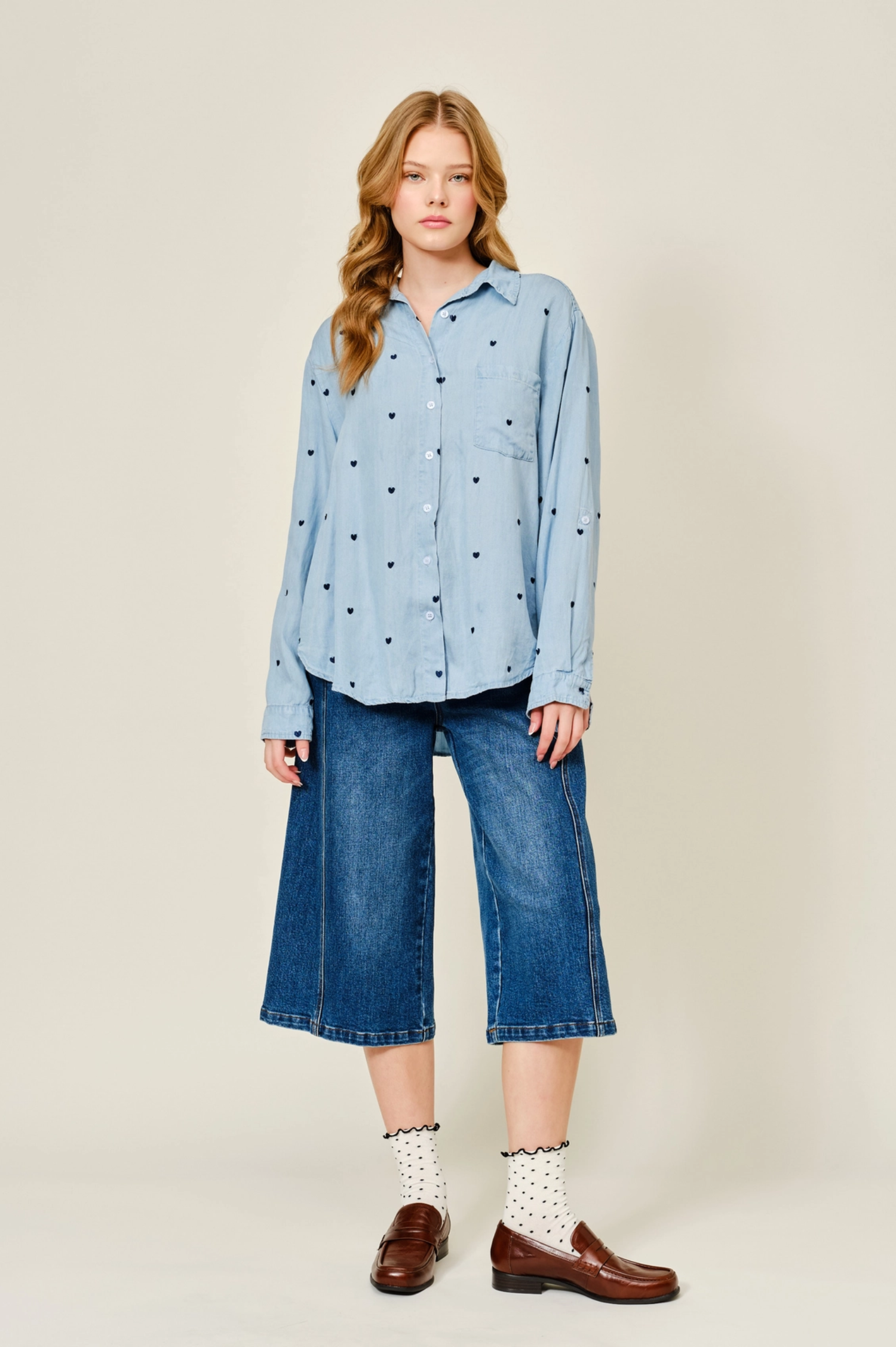 This Love Letter Chambray Button Up is your go-to for effortless style. Soft chambray fabric, classic button-up design, and a relaxed fit that works solo or layered. Dress it up or down—it's the versatile piece every closet needs.