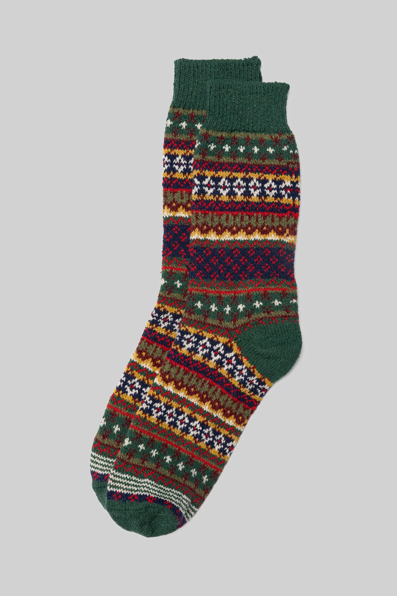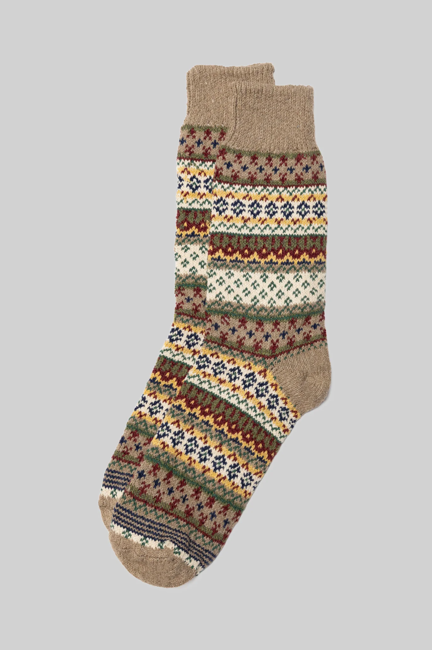 Our version of this timeless accessory borrows from traditional Fair Isle motifs. Its Scottish roots seem appropriate – that's to say, you might have guessed these intarsia knits came from ye olde inspiration. An elastic-lined welt ensures this sock stays high on the calf. The matching heel-toe is a nice touch, bookending the pattern from beginning to end.