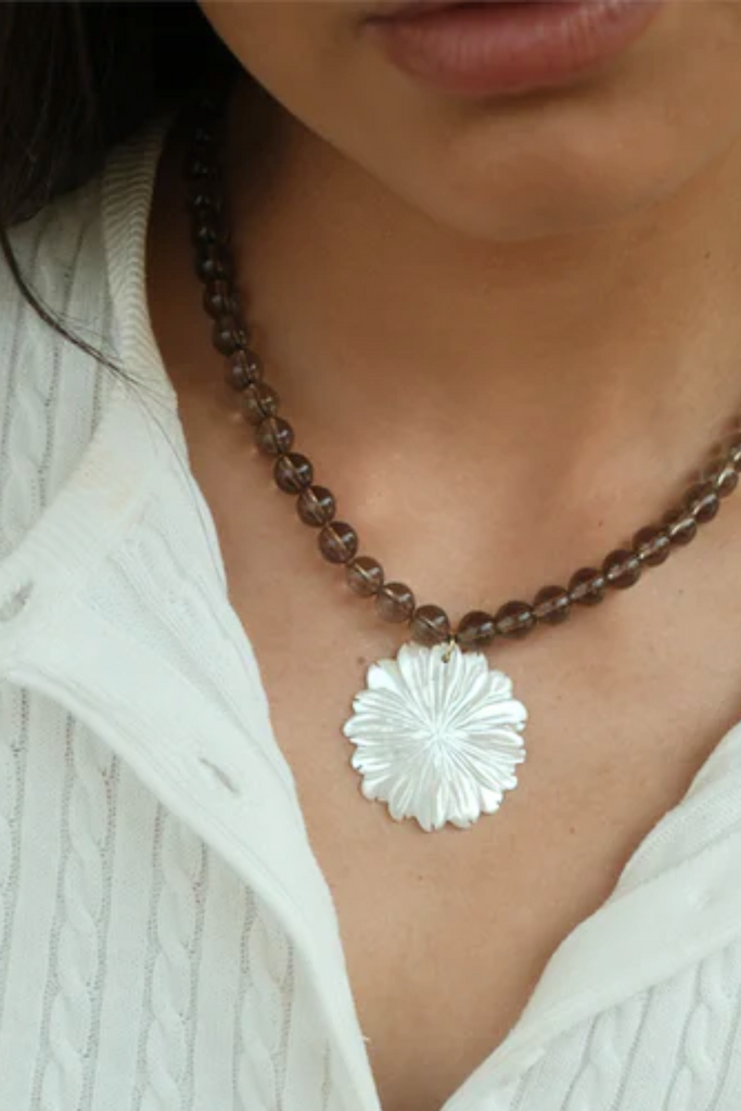 Hand knotted with pearls and finished with a hand-etched shell pendant and an 18k gold plated sterling silver clasp. 16-18" adjustable length