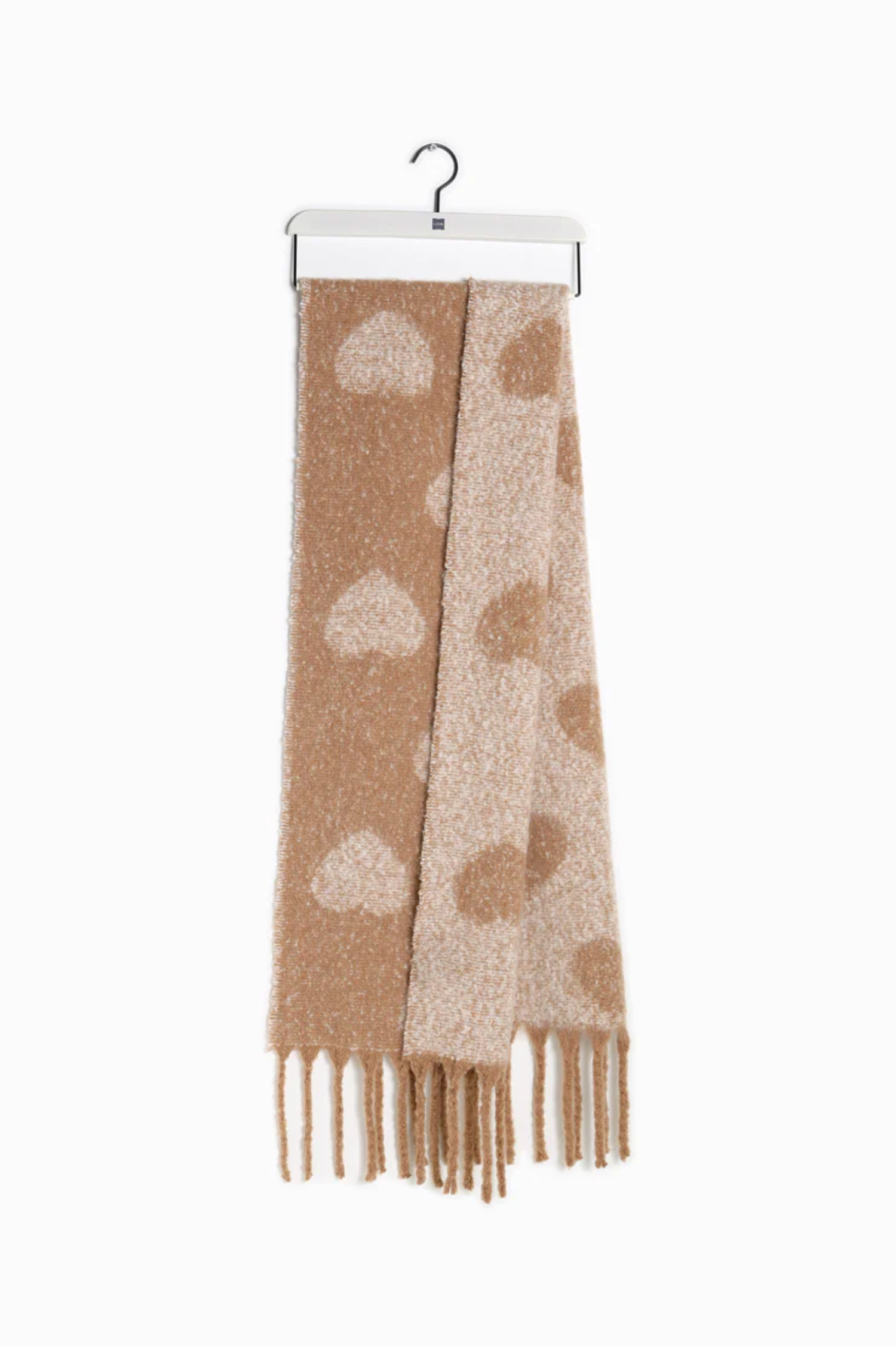 A versatile double-sided scarf featuring delicate heart motifs and tassels. The quality knit provides warmth while maintaining an elegant aesthetic, making it an effortless addition to any winter look.