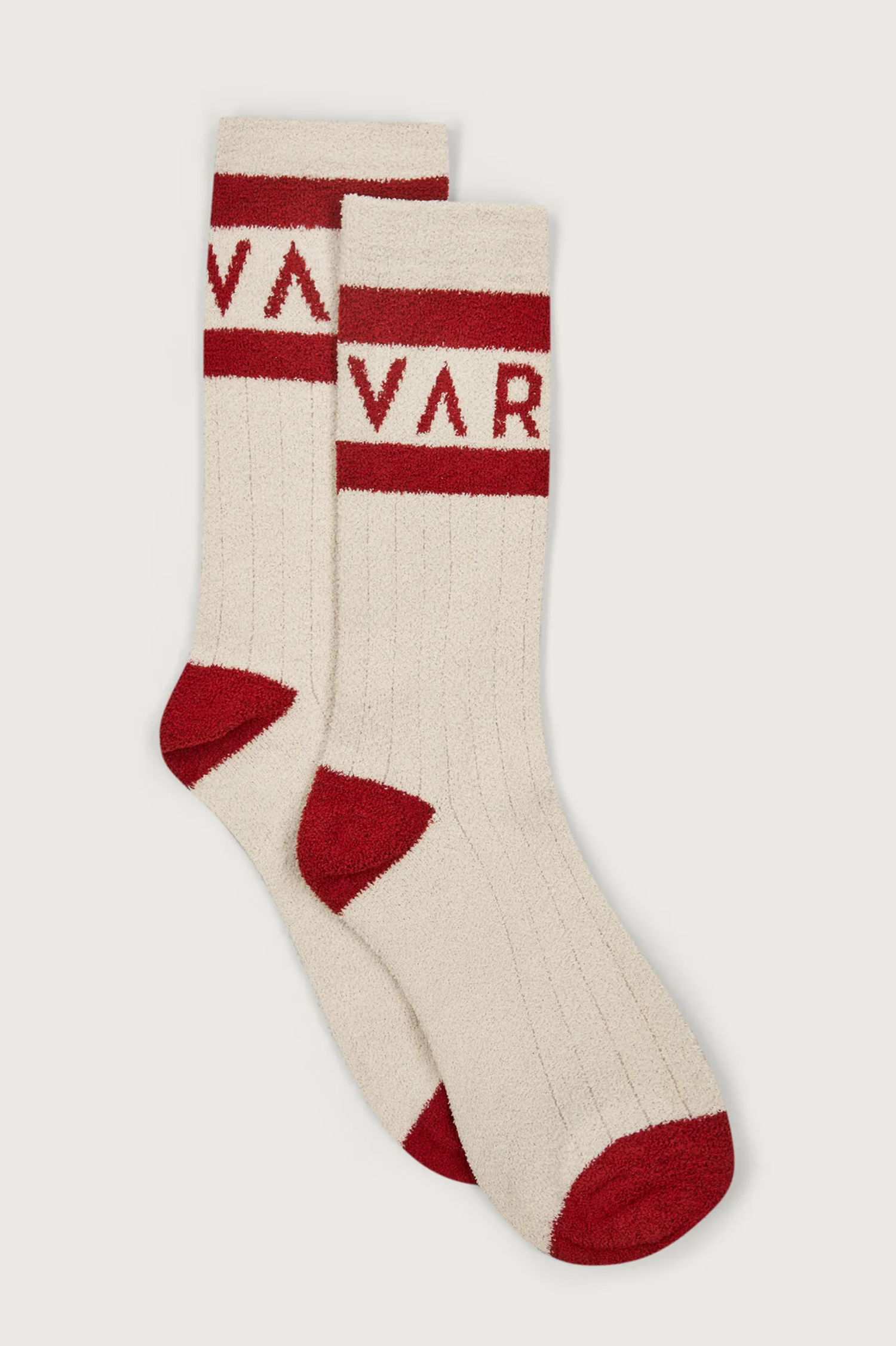 Woven in a boucle-effect yarn, the Spencer socks feature a classic Varley logo stripe and contrast heel and toe.