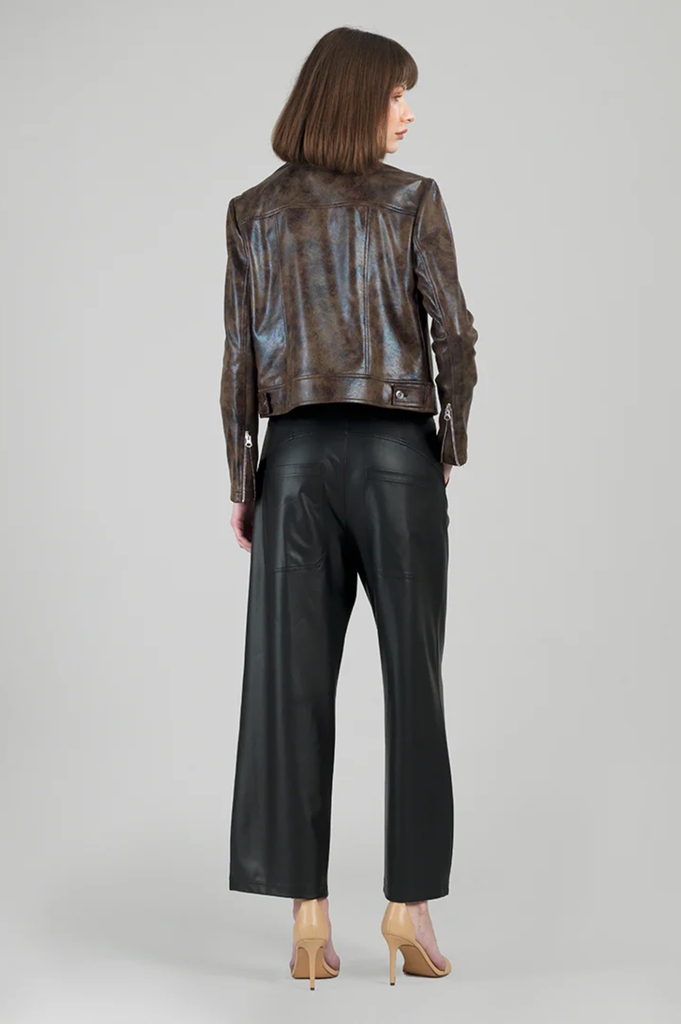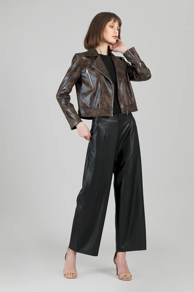 Your shortcut to instant edge lies in our Vegan Leather Distressed Zip Cuff Moto Waist Jacket! This uniquely modern jacket features a beautiful, radiant matte finish, a classic fold-over collar with a notched lapel, long sleeves with zipper cuff details, an asymmetrical closure with silver hardware, zippered chest accents, a back yoke with two vertical side back seams, and a seamed waist-length hemline with an adjustable button hem detail.