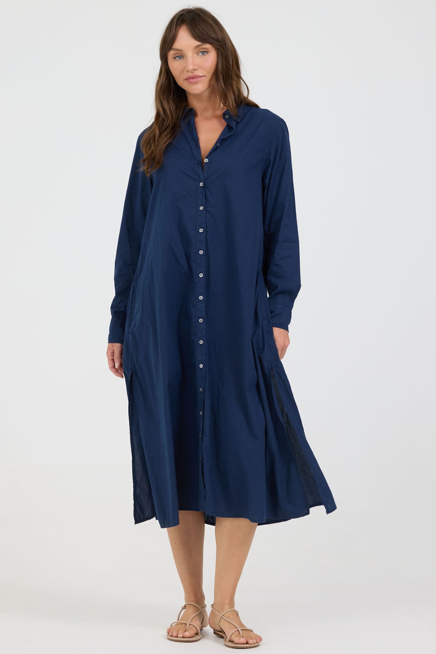 This poplin dress is a perfect blend of style and comfort, ideal for any occasion ranging from casual to holiday wear. Featuring a midi length with a button front and collar, this garment dyed floral print poplin dress offers a relaxed fit that accentuates its casual charm.