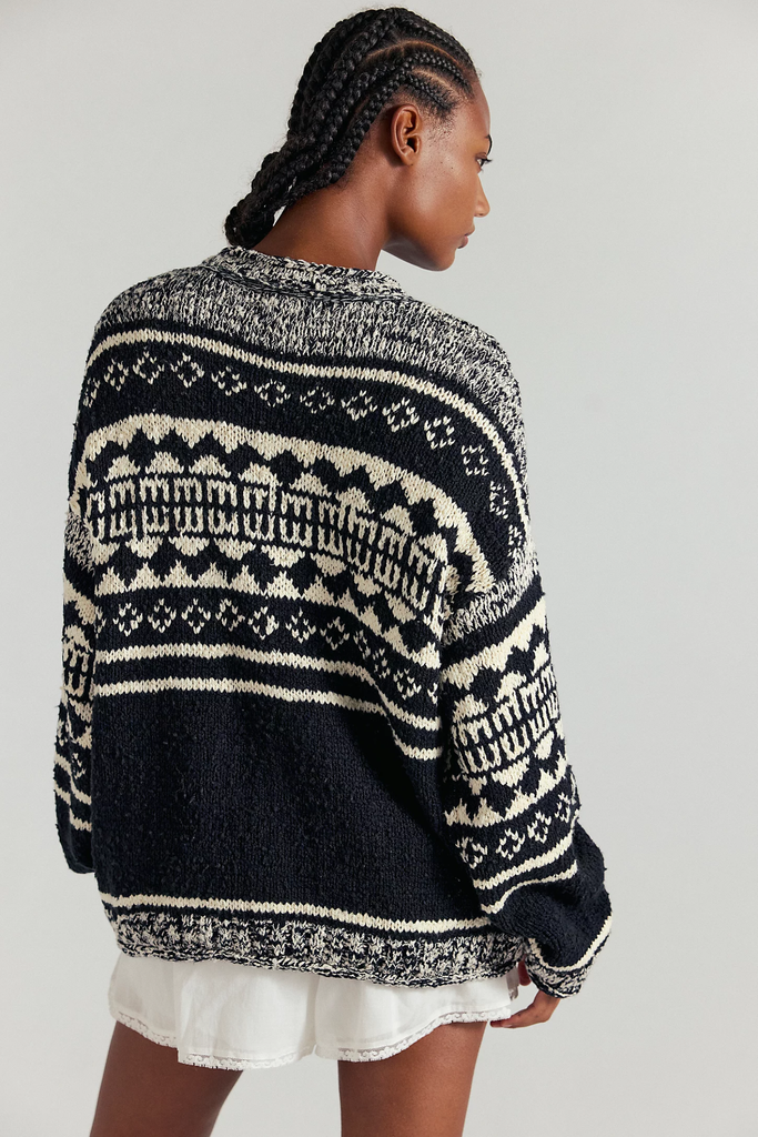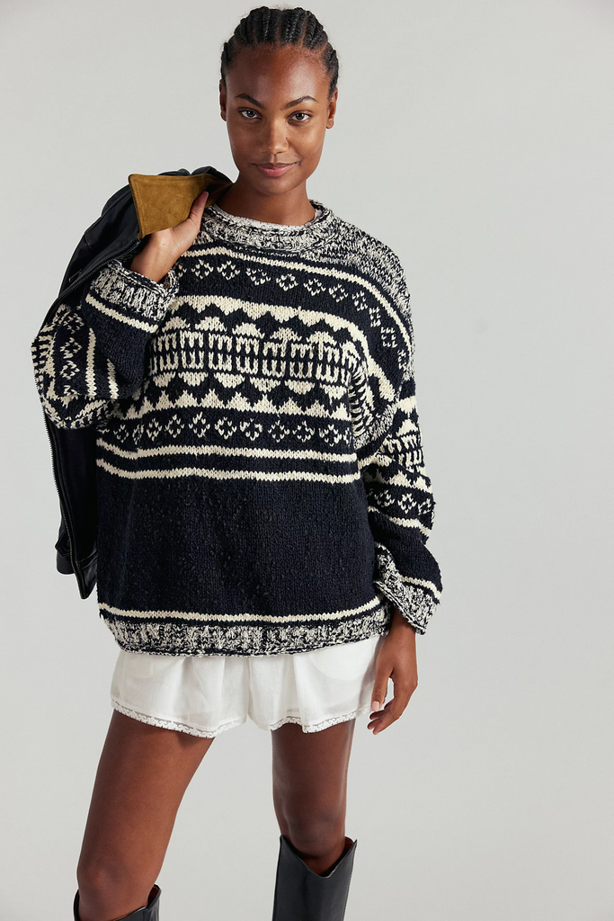 Effortless comfort and style are yours in this cozy long-sleeve sweater, featuring a slouchy oversized fit, knit fabrication, and a charming Fair Isle-inspired pattern.