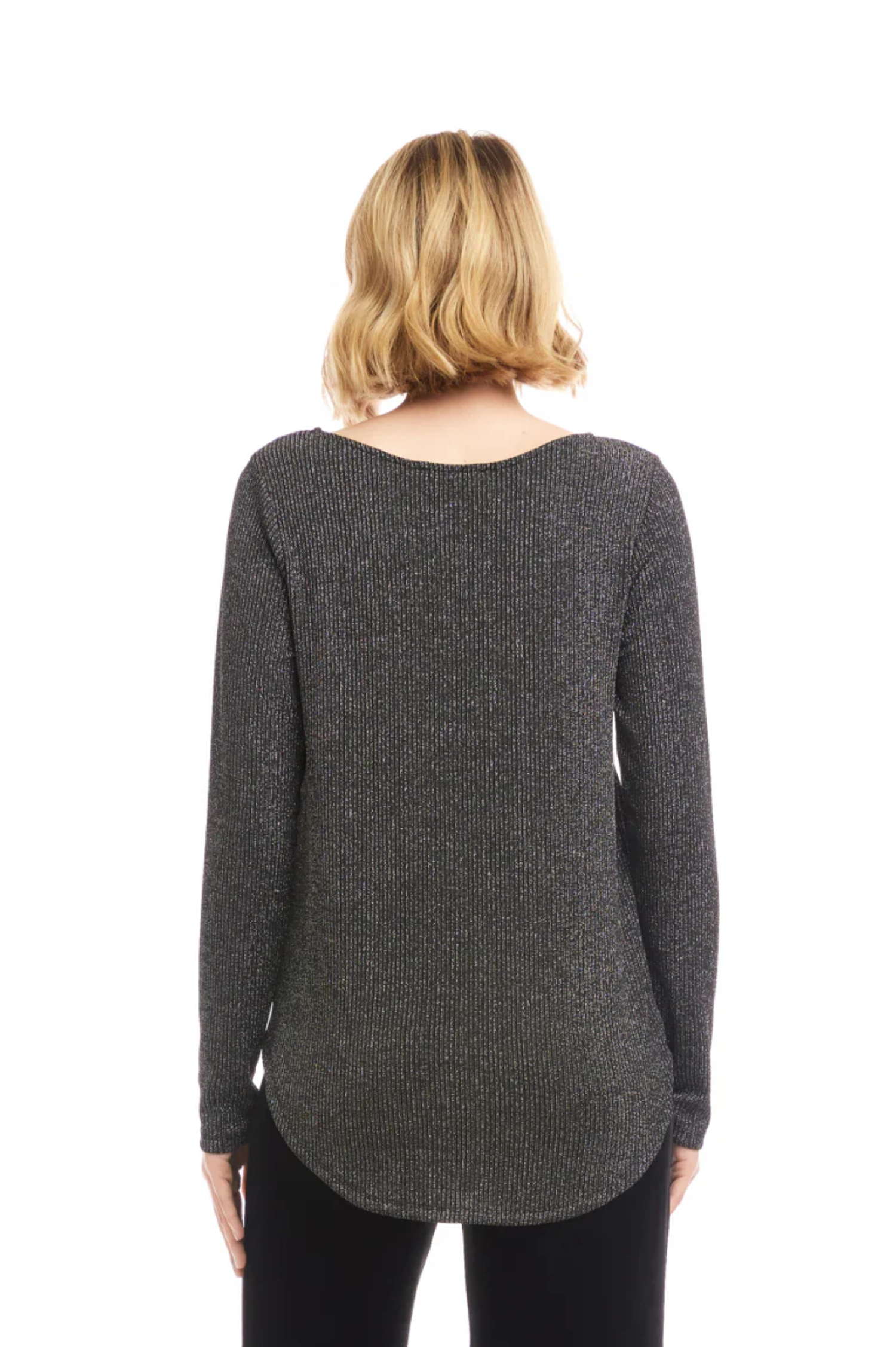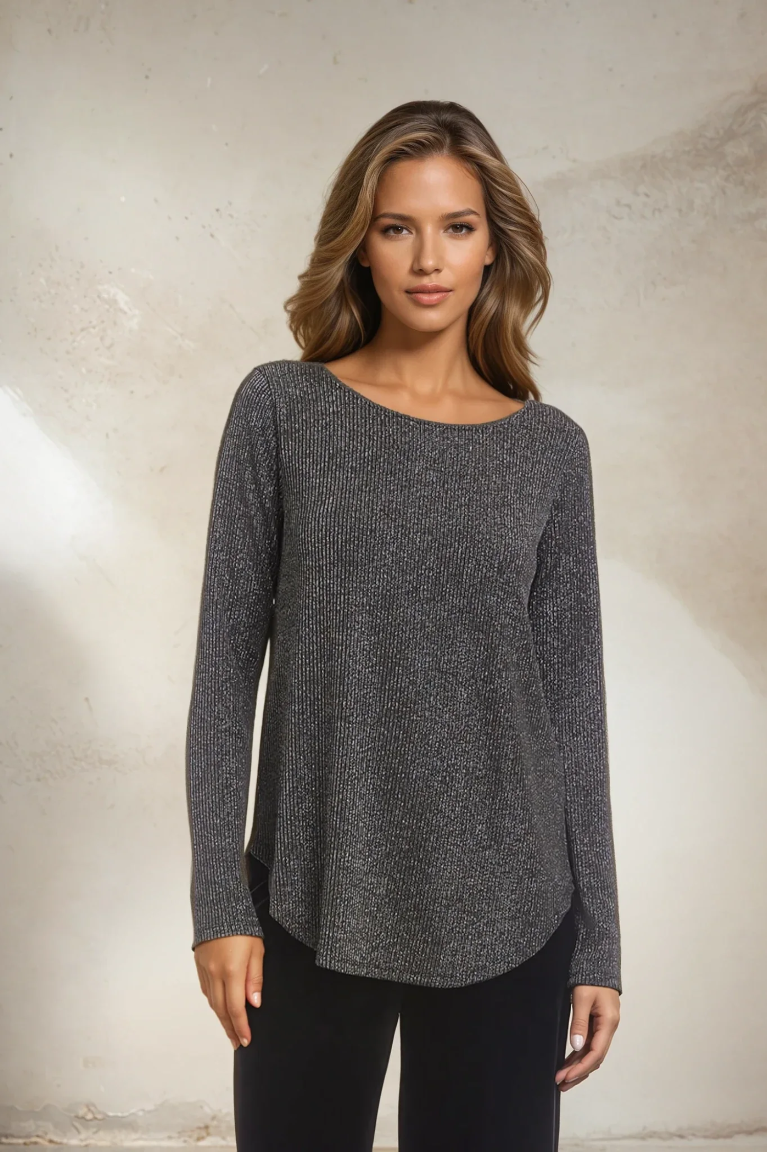 Add a touch of shine to your everyday look with this long sleeve top, crafted from a metallic stripe knit. Featuring a flattering scoop neckline and a curved shirttail hem, it blends comfort with statement style. Designed as an easy pull-on style, it’s perfect for effortless day-to-night dressing.