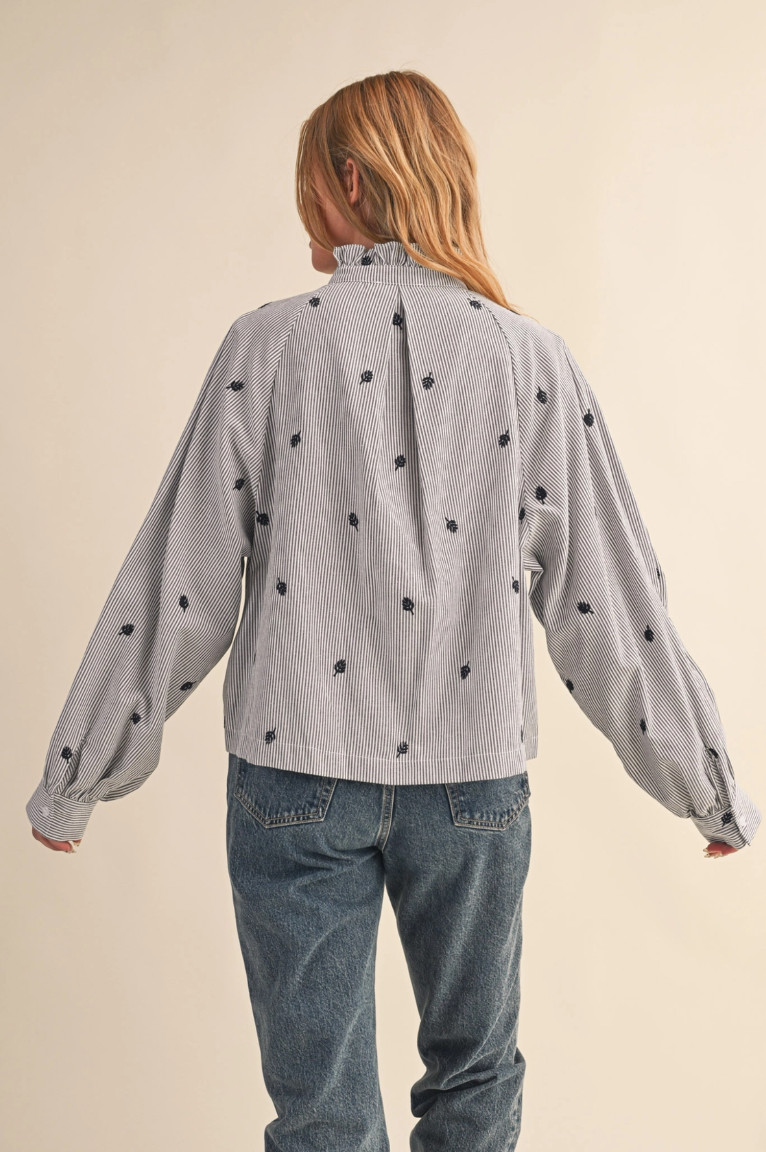 The flattering fit of this embroidered mock neck striped top will make this your go-to look this season! Striped woven fabric, with darling leaf embroidery throughout, shapes this top that has a ruffled mock neckline, button down placket, front pocket, and long puff sleeves with buttoned cuffs. Pair with jeans and boots for a look that flatters!
