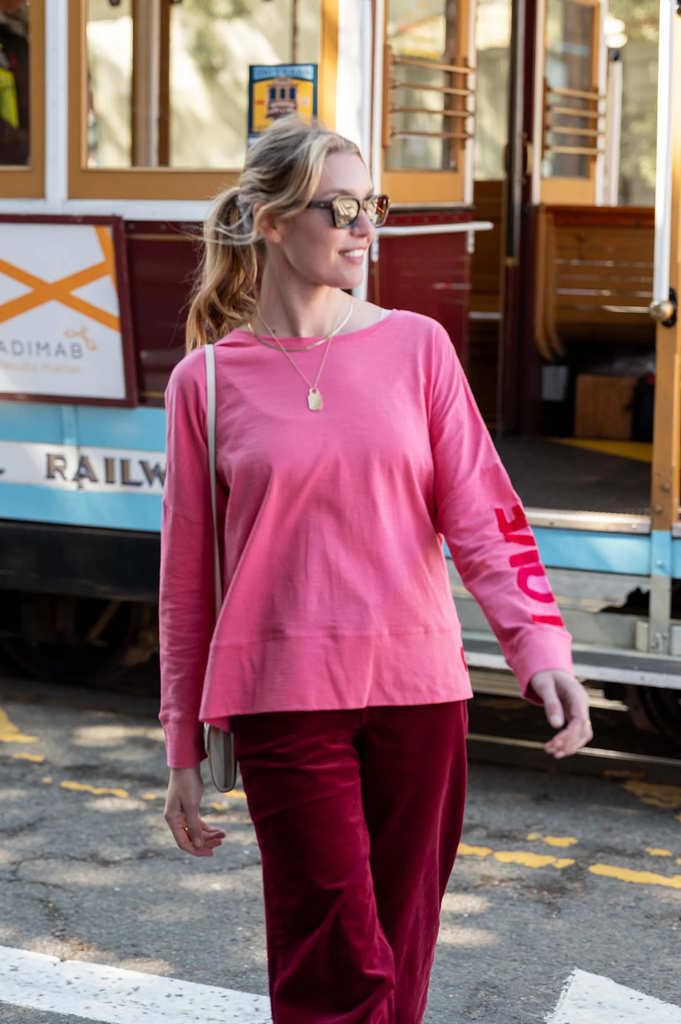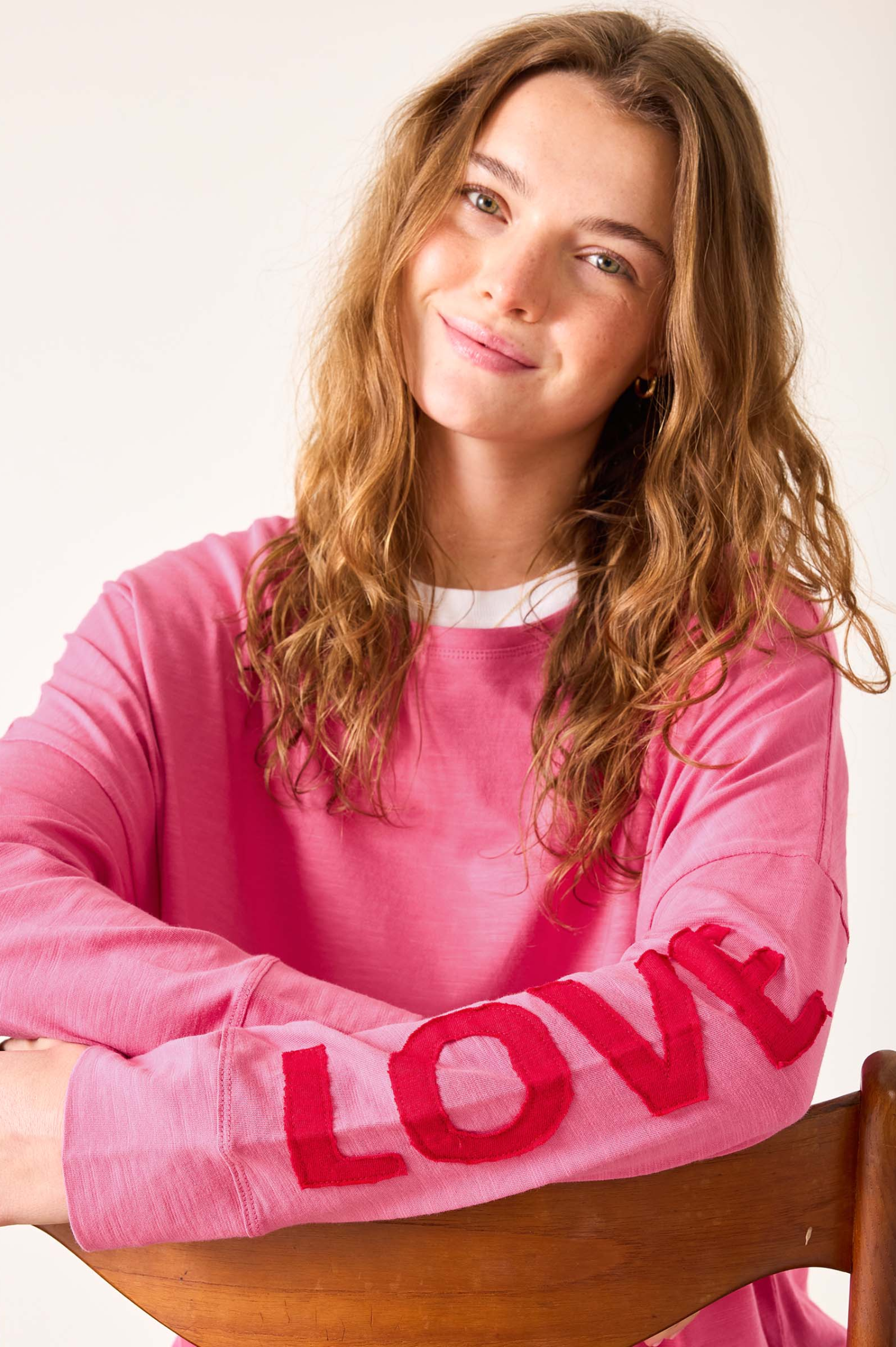 A love letter in tee form, based on our best-selling Amour Sweater. Adorned with heart appliqués and featuring loose shoulders and short side slits for comfort. This faithful, charming tee is perfect for all seasons—let’s face it, love is always in style.