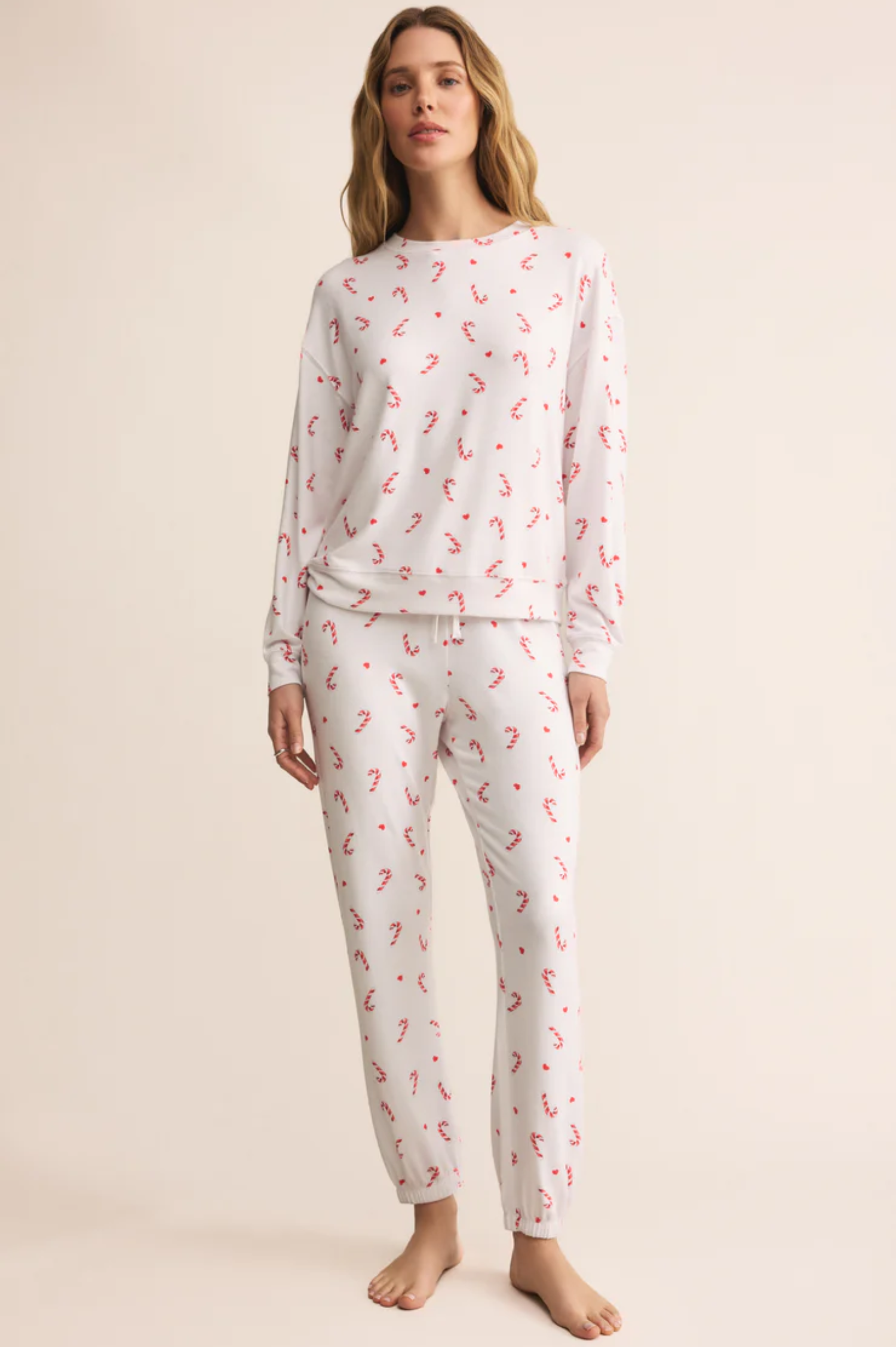 Sweet and seasonal, this relaxed set is crafted in silky jersey with a playful candy cane print. With a classic crew neck top and high-rise jogger, it’s the kind of festive cozy she’ll want all winter long.