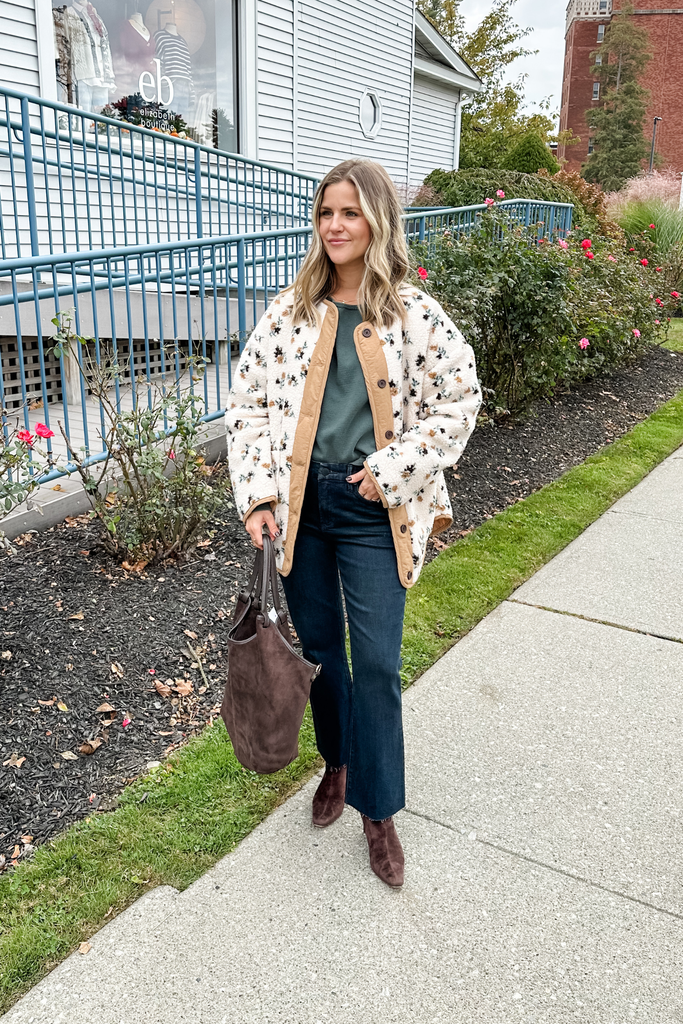 Floral fleece meets classic buttons in the Sophia Sherpa Button Jacket, creating a cozy layer that adds a touch of charm to your cool-weather wardrobe.