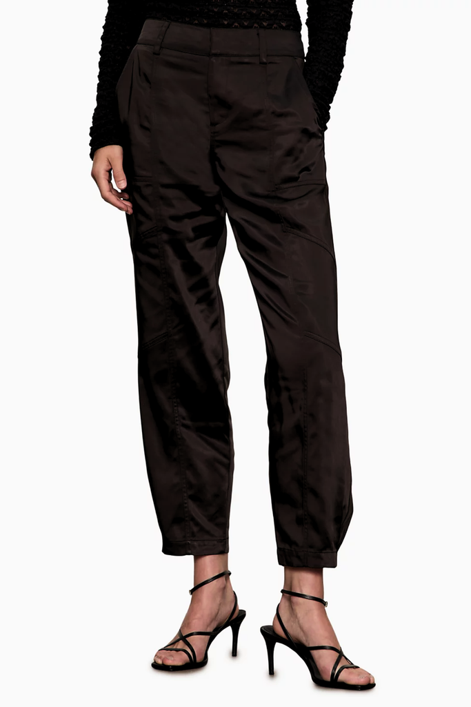 Every movement feels effortless in these Sanctuary Sahara satin tapered pants, crafted with a mid-rise silhouette. Handy front and back pockets provide convenience. The hook and bar fastening secures the fit.