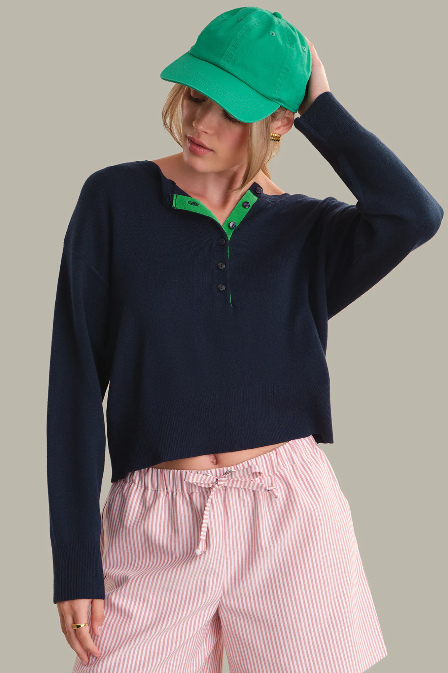 The Contrast Henley is a cozy, long-sleeve knit top featuring a button-down front with distinctive contrast trim along the placket, adding a modern twist to a classic silhouette. Designed for comfort and versatility, its knit construction and relaxed fit make it ideal for layering or wearing on its own.