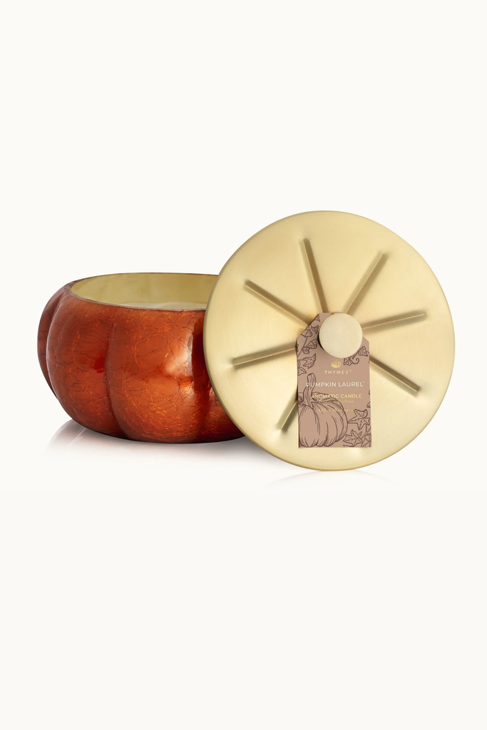 Embrace the autumn season and let moments of nostalgia fill your home with this statement candle. A nod to the season, this pumpkin-shaped candle creates a stunning home decor piece with its burnt orange, crackled finish, mercury gold accents, and complimentary gold lid. Enjoy the beautiful glow this candle creates and the classic mix of sweet and spice this fragrance evokes.
