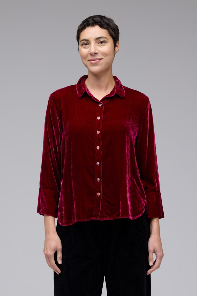 This cropped shirt offers a soft, luxurious feel with a relaxed fit and gently dropped shoulders, complemented by a sleek button-down front. Crafted from rich velvet, it brings refined texture and elegance, making it ideal for both casual and polished looks.