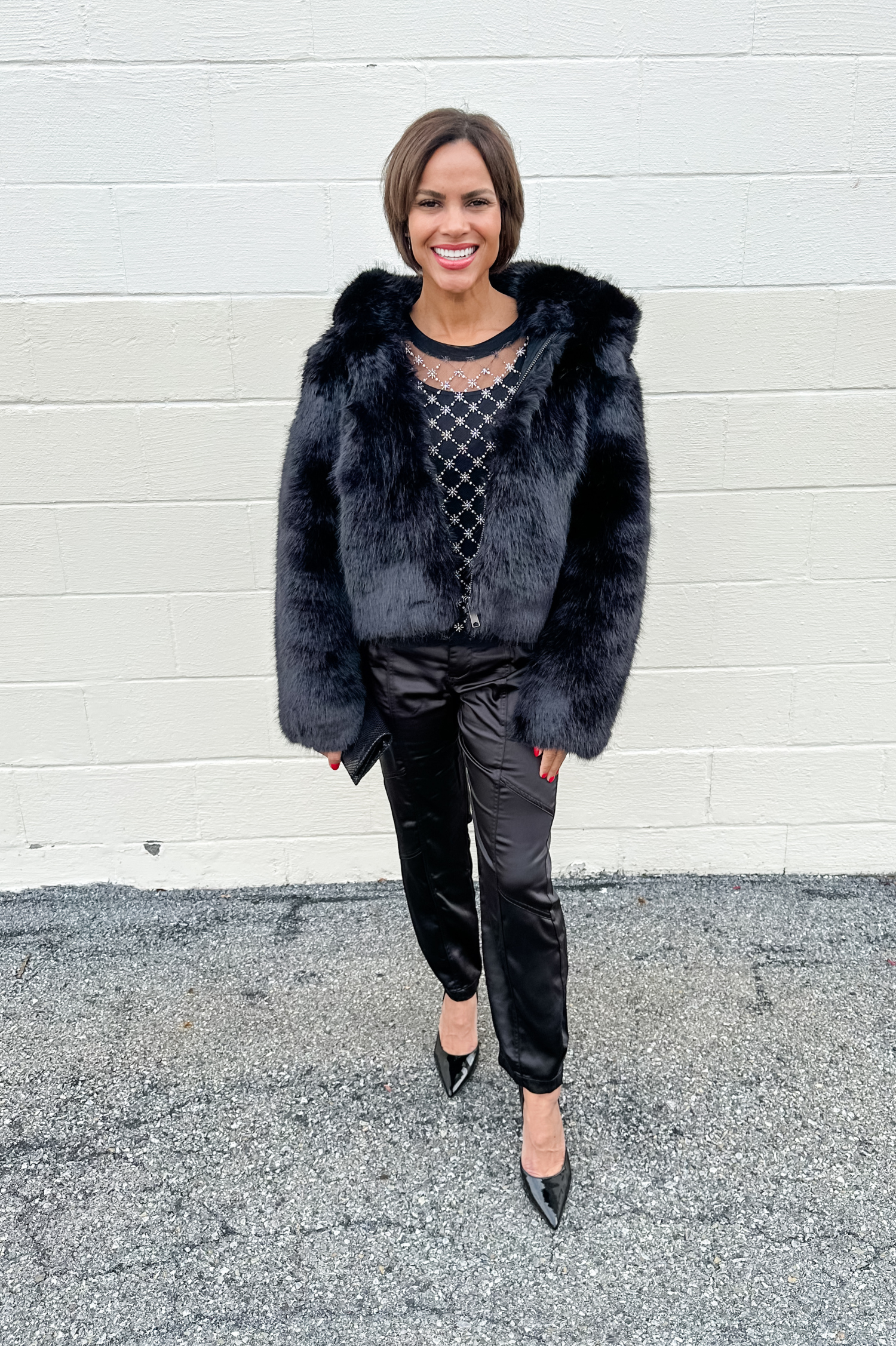 The lush life is all yours in this luxe fur jacket, featured in a faux style with an attached hood for extra cozy moments.