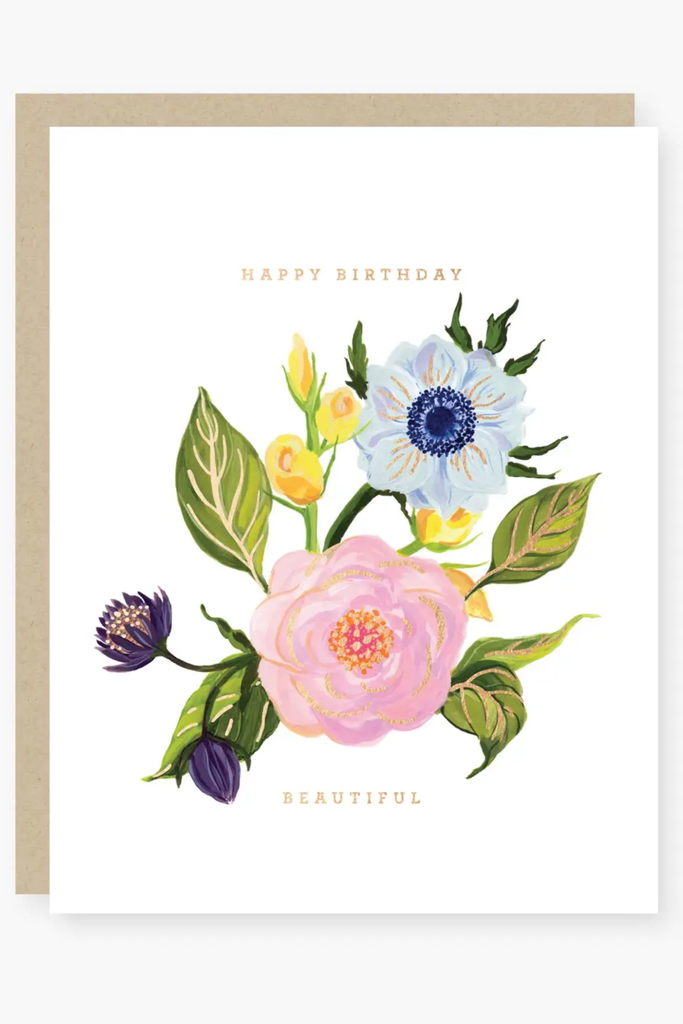 Gorgeous garden forals painted to send a beautiful happy birthday wish! Accented with gold foil.