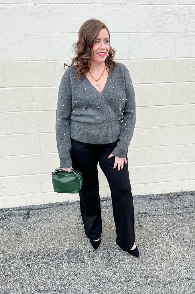 Elegant and feminine, this long-sleeve sweater features a faux-wrap design with a deep V-neckline and pearl embellishments throughout. Crafted with minimal wool for a soft, lightweight feel and finished with a ribbed hem. Pull-on style for easy wear.