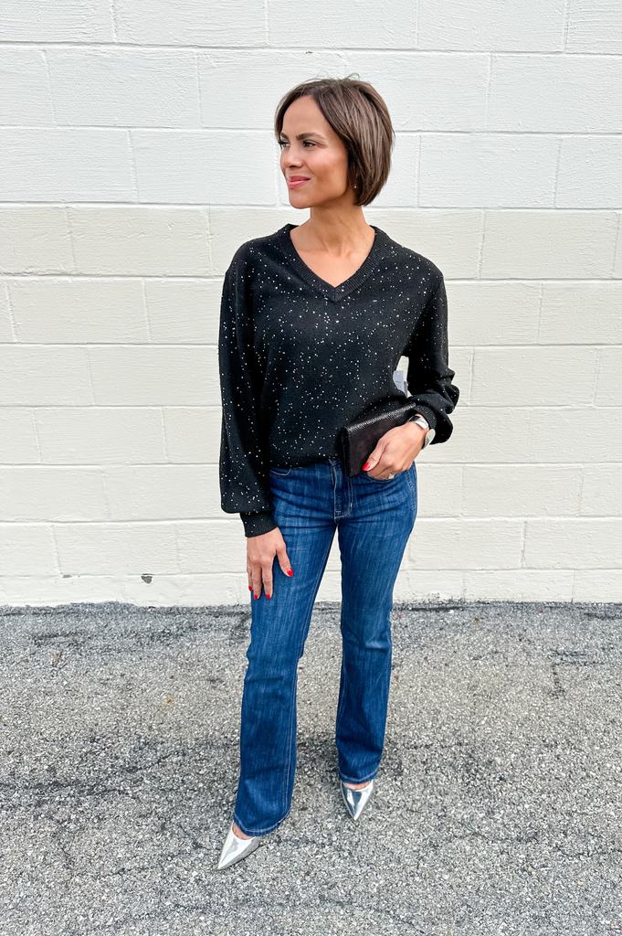 Add a touch of sparkle to your look with this long-sleeve sweater, featuring an elegant V-neckline and allover subtle sequin accents. Finished with ribbed edges at the neckline, cuffs, and hem for a polished look and added shape retention.