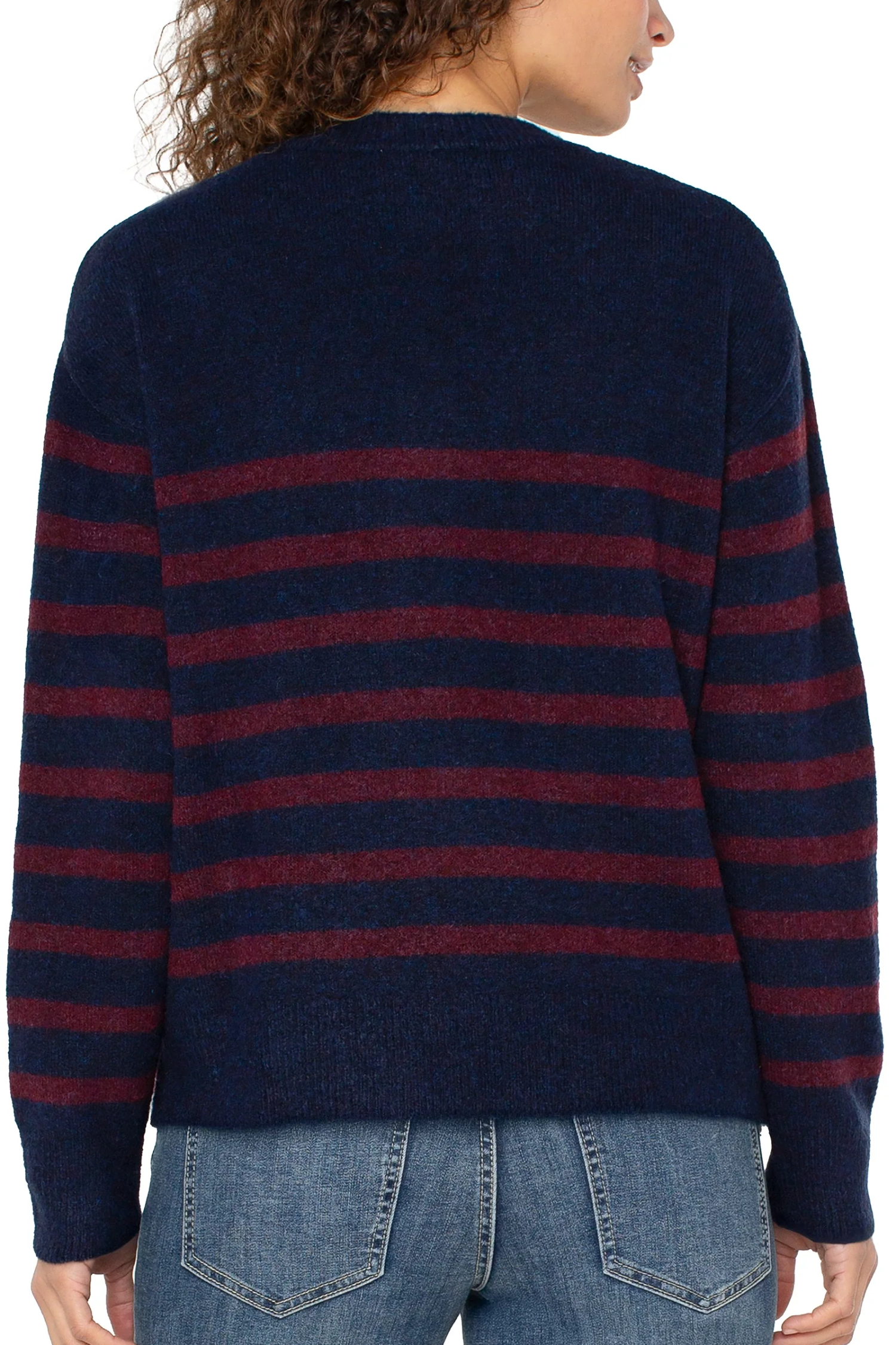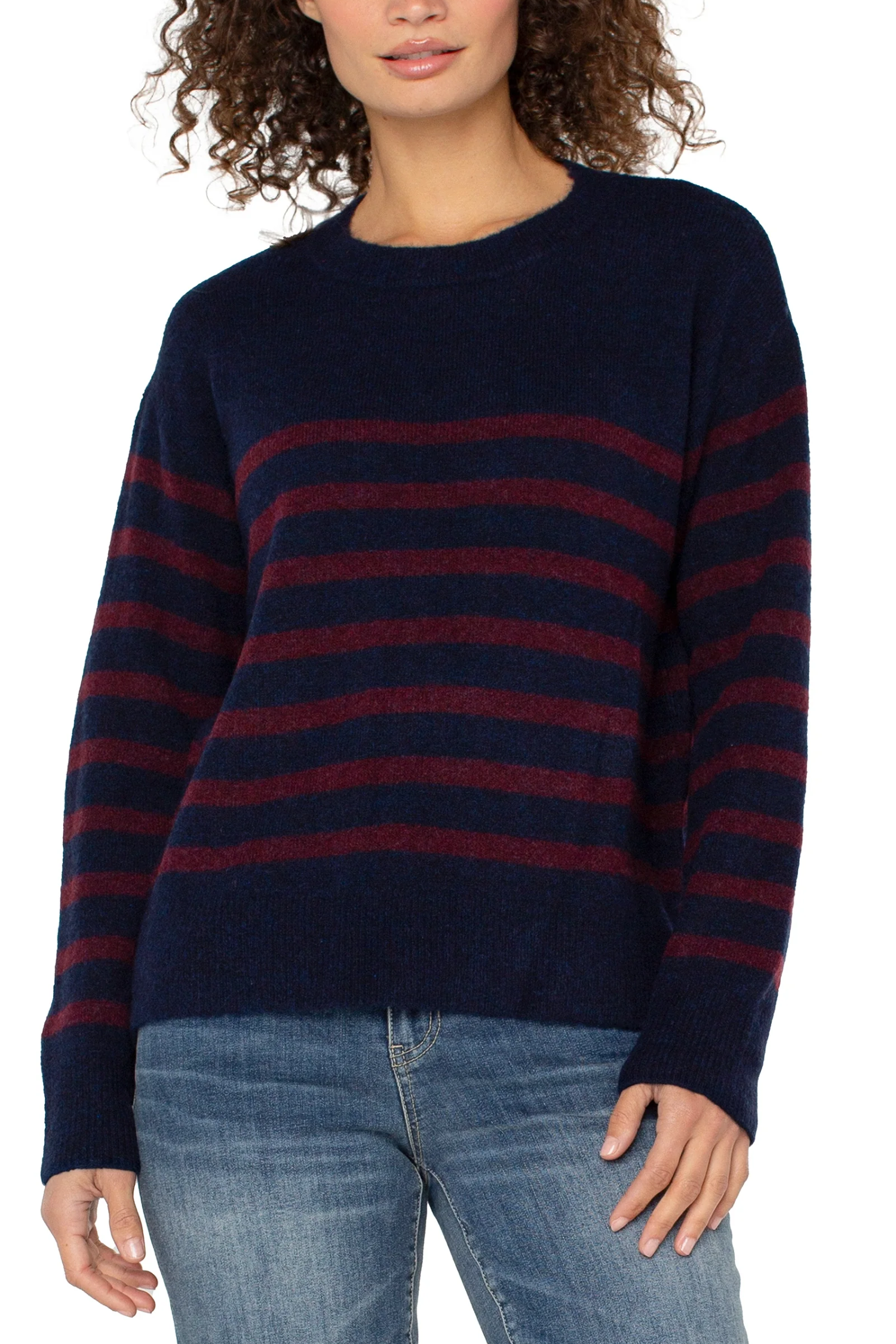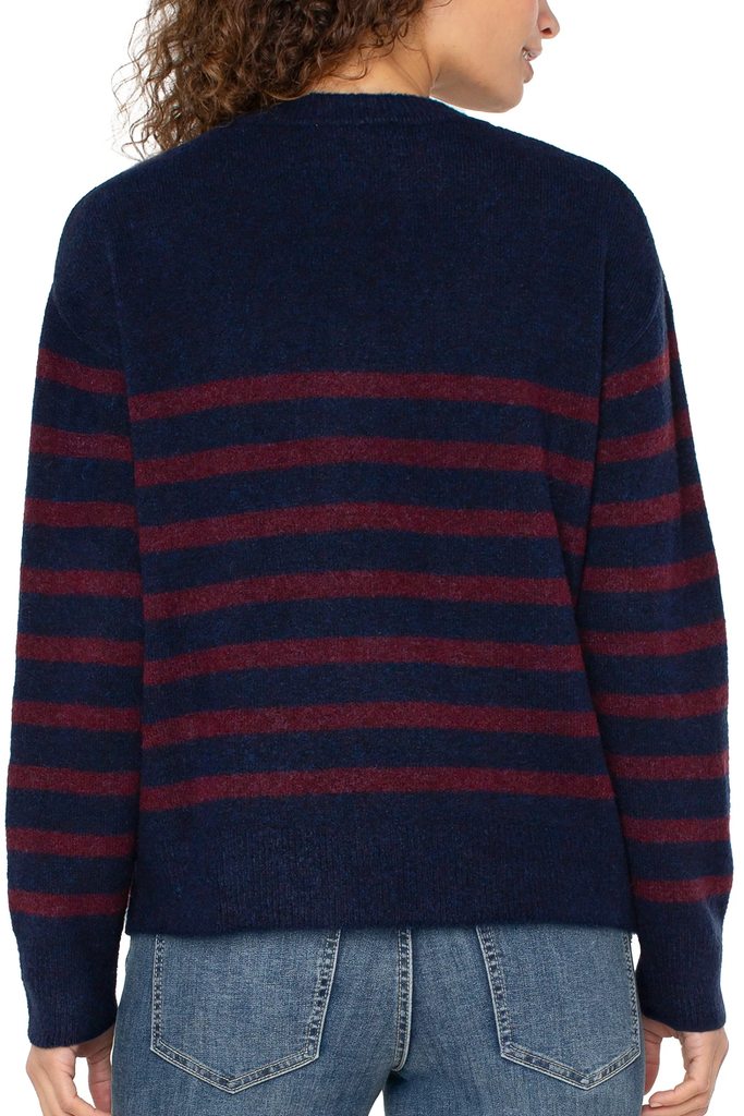 Everyday ease, elevated. With a relaxed drop shoulder fit and bold stripe pattern, this sweater layers seamlessly with denim, trousers, or skirts for versatile styling.
