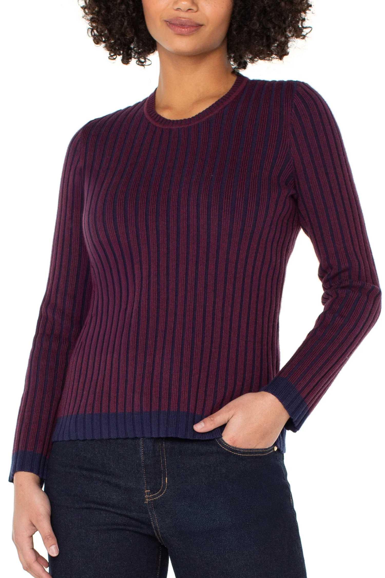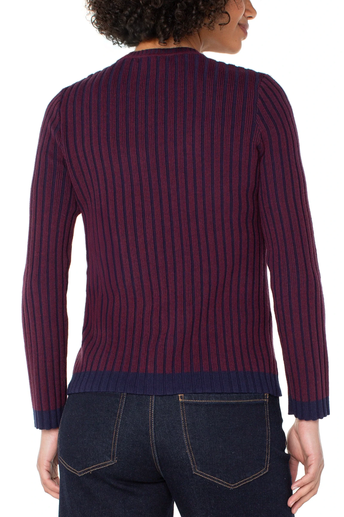 Classic knitwear, modern detail. This ribbed crew neck sweater in cabernet red is accented with navy contrast for a refined twist on a timeless silhouette.