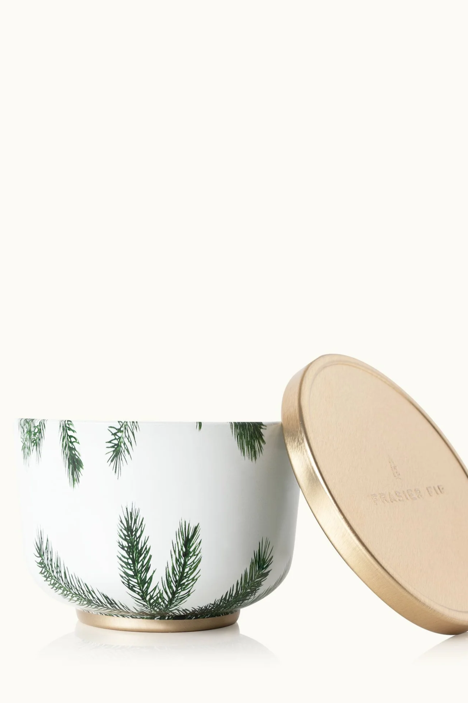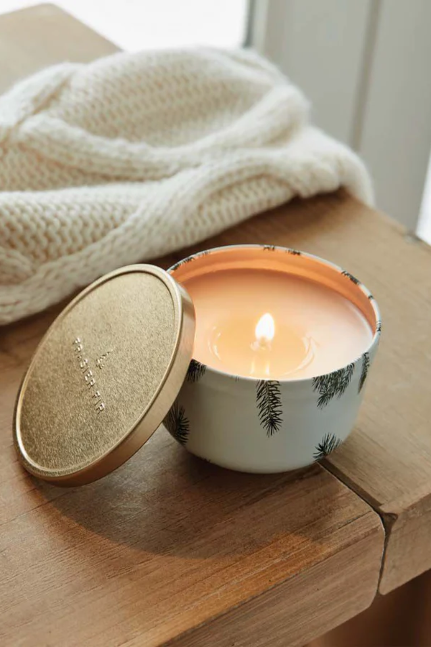 Mountain fresh and glowing, this perfectly sized poured candle tin with gilded gold lid fills your surroundings with the iconic fragrance of the season.