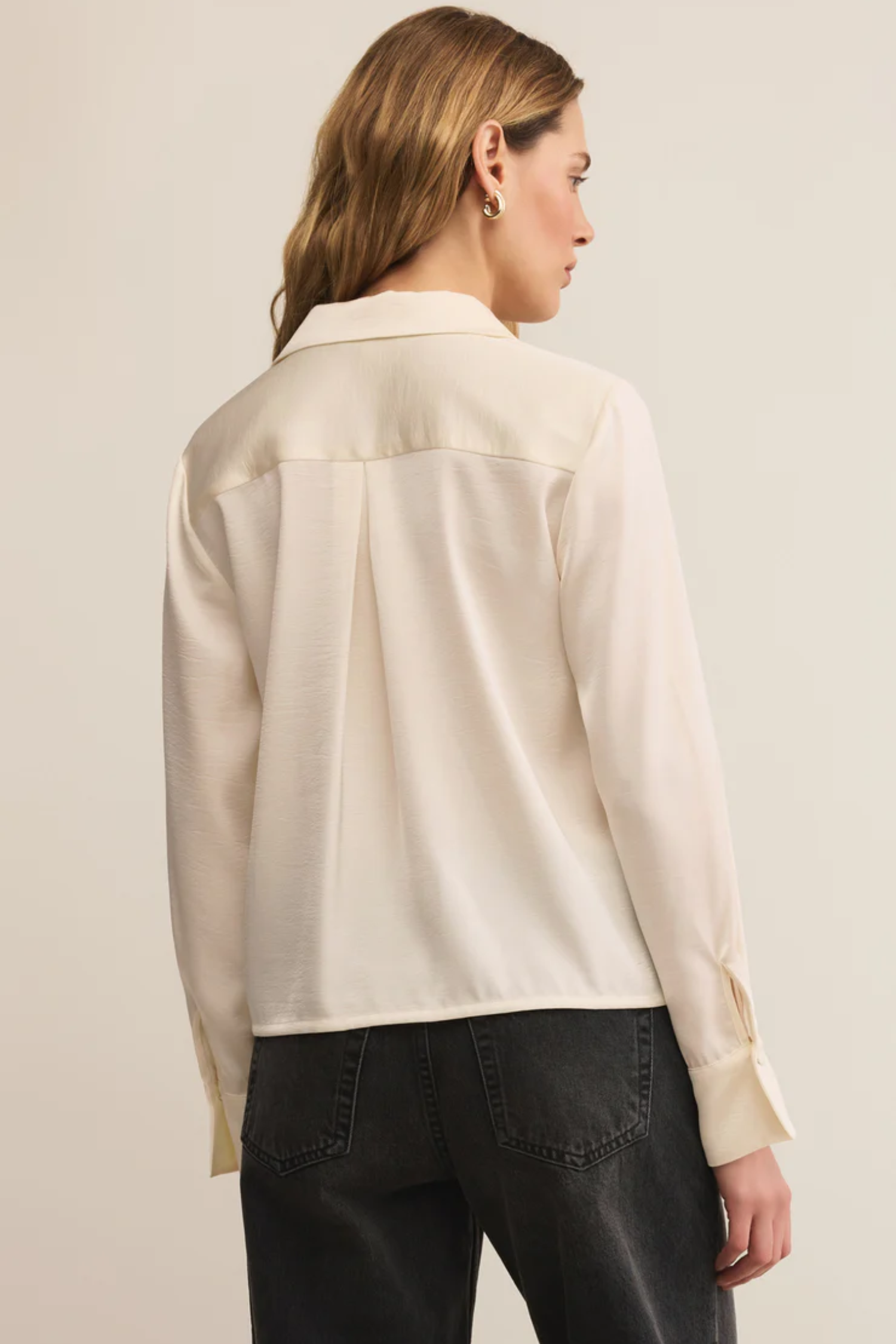 This luxe satin top offers a relaxed fit with a collared neckline and button-front design. Its fluid drape and understated sheen make it a versatile staple for workdays or nights out.